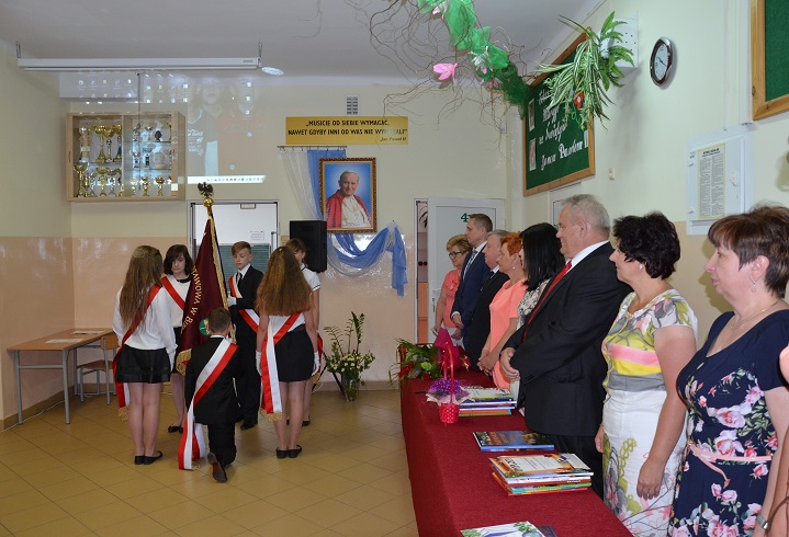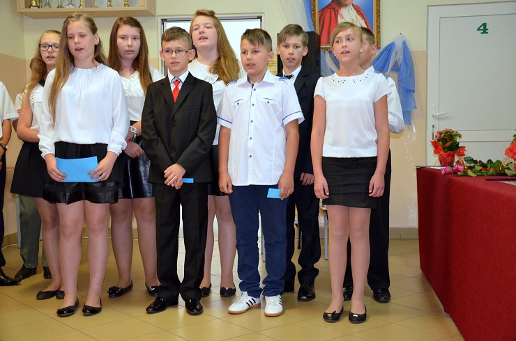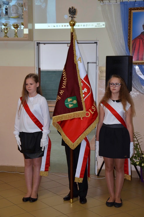 Poczet Sztandarowy w składzie: Mikołaj Zdunek, Karolina Budna, Aleksandra Krawczyk przekazał Sztandar Szkoły klasie V: Sebastianowi Kucharczykowi, Oliwii Szczepanik i Natalii Szymańskiej.