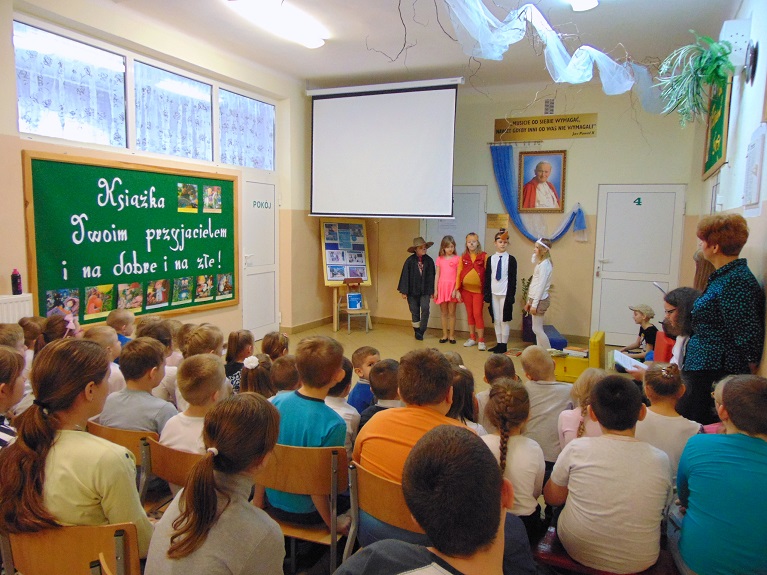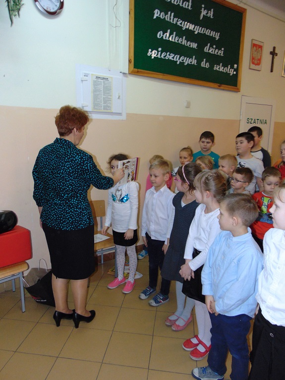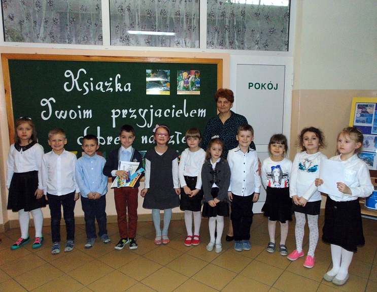 Bibliotekarka Beata Palasek pasowała uczniów klasy I „Encyklopedią dla dzieci” na czytelników szkolnej biblioteki. Pierwszoklasiści musieli wcześniej wykazać się znajomością popularnych bajek, baśni, wierszy. Dopasowywali zagadki, tytuły bajek na podstawie różnych rekwizytów. Obejrzały prezentację pt. „Bajkowe postaci”. Pochwaliły się także znajomością wierszy Jana Brzechwy. Przygotowały razem z wychowawcą Anną Ponichterą recytację tych wierszy oraz zaśpiewali piosenkę „Świat to wielka tajemnica”.