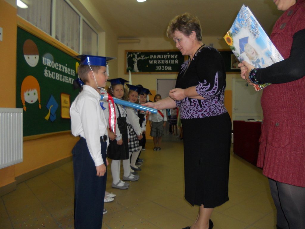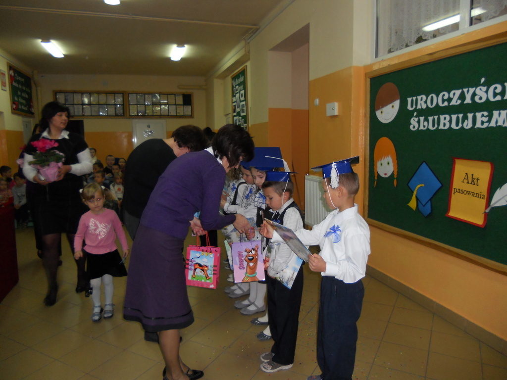 Miłą niespodzianką były drobne upominki wręczone przez Samorząd Uczniowski, który w imieniu wszystkich uczniów szkoły powitał pierwszoklasistów w swoim gronie. Na zakończenie pani dyrektor serdecznie podziękowała nauczycielom, rodzicom i uczniom za przygotowanie wspaniałej uroczystości, wręczyła pamiątkowe dyplomy, życzyła najmłodszym wytrwania i wielu sukcesów w nauce.