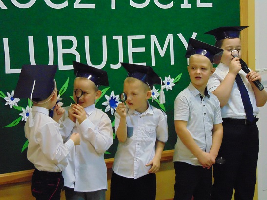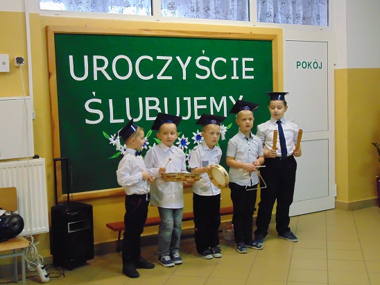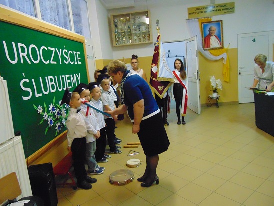 Następnie dzieci zaprezentowały swoje umiejętności w specjalnie przygotowanym przedstawieniu, w którym brali również udział uczniowie klasy IV. Uczniowie klasy pierwszej obiecali, że będą: pilnymi i wzorowymi uczniami, dobrymi kolegami, przyjaciółmi roślin i zwierząt, dbać o dobre imię klasy i szkoły, kochać swój kraj oraz należycie wypełniać obowiązki ucznia. Czwartoklasiści obiecali służyć pomocą w wypełnianiu tych obietnic.