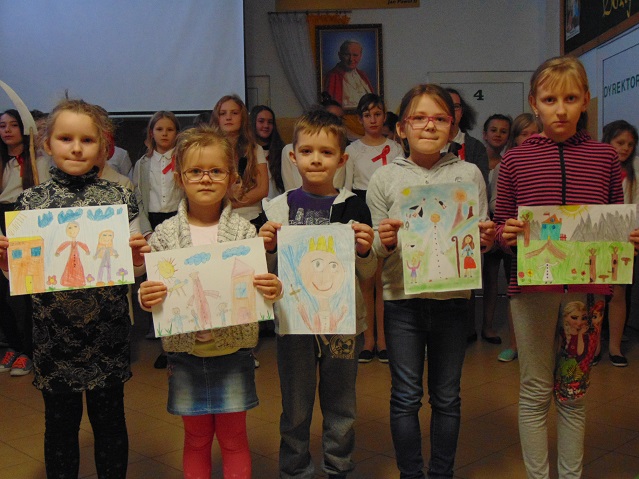 Spotkanie stało się też okazją do ogłoszenia wyników konkursu plastycznego pt. "Jan Paweł II - Patron naszej szkoły", który został przeprowadzony w oddziałach 0-III. Laureaci konkursu to: Luiza Łach, Maja Ślesicka (oddział przedszkolny), Damian Leszczyński (klasa I), Martna Leszczyńska (klasa II) oraz Daria Bartniczak (klasa III).