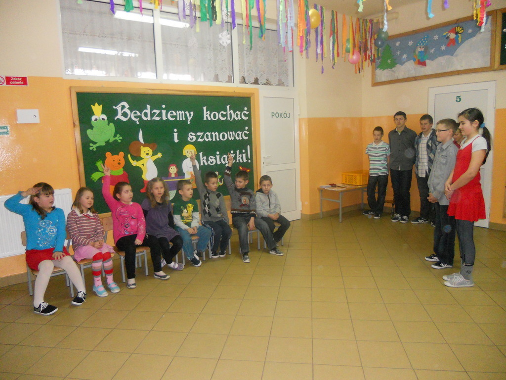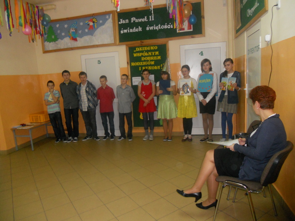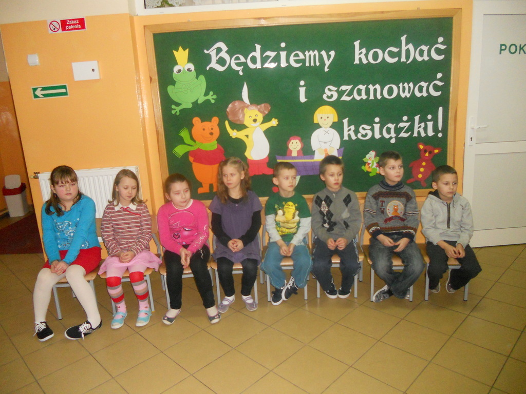 Występ przygotowali uczniowie kl. VI pod kierunkiem wychowawczyni pani Beaty Palasek. Przedstawili pierwszoklasistom prośby książek, zwrócili uwagę na to, aby szanować i dbać o nie oraz podkreślili znaczenie i wartość płynącą z czytania książek. Zaprezentowali szereg pozycji książkowych, po które warto sięgnąć.