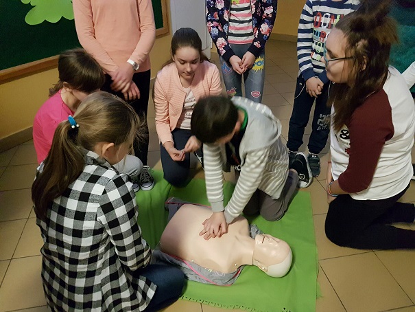 Uczniowie klasy piątej zaprezentowali jak udzielać pierwszej pomocy i w jaki sposób należy przeprowadzać resuscytację, która często ratuje życie innym ludziom.