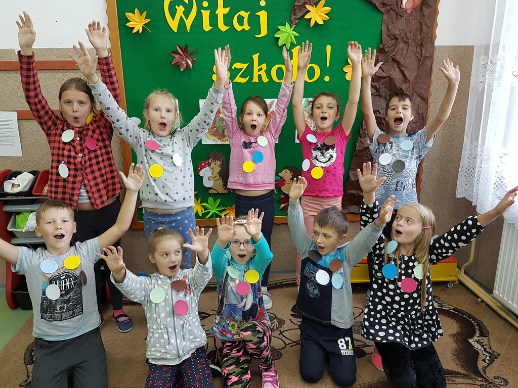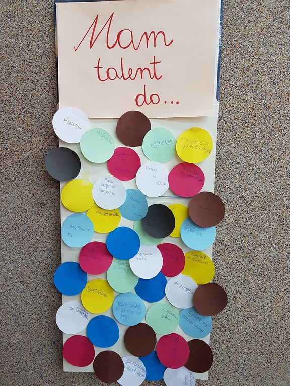 Tego dnia wszyscy chodzili "zakropkowani". Uczniowie klasy III rozwiązywali zadania, których bohaterem była kropka. Następnie każdy zapisał na swojej kropce, jaki ma talent. Wszyskie kropki umieściliśmy na jedej planszy, którą powiesiliśmy w naszej sali. Mamy w klasie super zestaw talentów