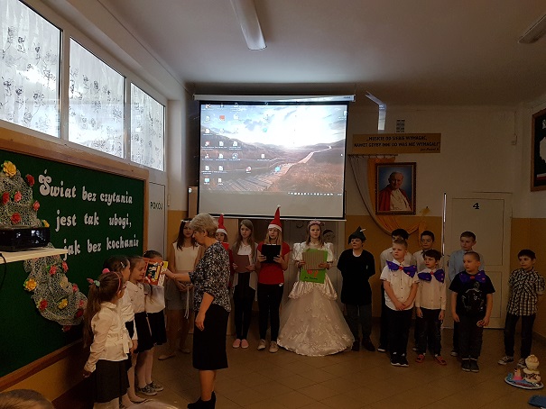 Uroczystość poprowadziły uczennice klasy V: K. Dziewulska, K. Falba, O. Ogrodnik, K. Godlewska, K. Kucharczyk, które wcieliły się w postacie z bajek i baśni. Pozostali ucz. klasy V wzięli udział w inscenizacji pt. „Zaczarowany świat bajek”. Uczniowie klasy II zaprezentowali wiersz Jana Brzechwy „Na wyspach Bergamutach”. Pierwszoklasistki wykazały się znajomością baśni i bajek, świetnie rozwiązywały zagadki, potrafiły odpowiedzieć na pytania dotyczące biblioteki. Na pamiątkę otrzymały dyplomy oraz książeczki od bibliotekarza, a od SU zakładki. Na koniec ucz. kl. I zaprezentowały piosenkę „Czarne jagódki”. Uroczystość zakończyła się wypożyczeniem pierwszych książek w bibliotece. Uroczystość przygotowała n-l biblioteki B. Palasek.