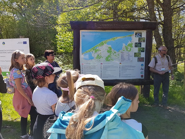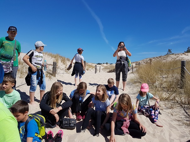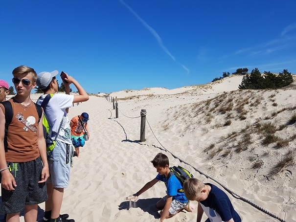 Następnego dnia udaliśmy się na zajęcia do Słowińskiego Parku Narodowego. Tematem naszych zajęć była Mierzeja Łebska z wydmami morskimi. Podczas zajęć dowiedzieliśmy się jak to możliwe, że wydmy wędrują. Okazało się, że przyroda nieożywiona tylko pozornie jest martwa i mało dynamiczna. Obszar Mierzei Łebskiej jest miejscem tworzenia się form eolicznych, związanych z akumulacją (osadzaniem) i deflacją (wywiewaniem piasku przez wiatr). Ruch piasku zaczyna się wtedy, gdy wiatr wieje z prędkością 5m/s. Wiatr przemieszcza cały zawarty w wydmie materiał zgodnie z kierunkiem dominujących wiatrów. Największą ruchliwość procesów eolicznych obserwuje się jesienią. Zimą można zaobserwować zjawisko „kurzenia wydmy” i posłuchać jej „śpiewu”.