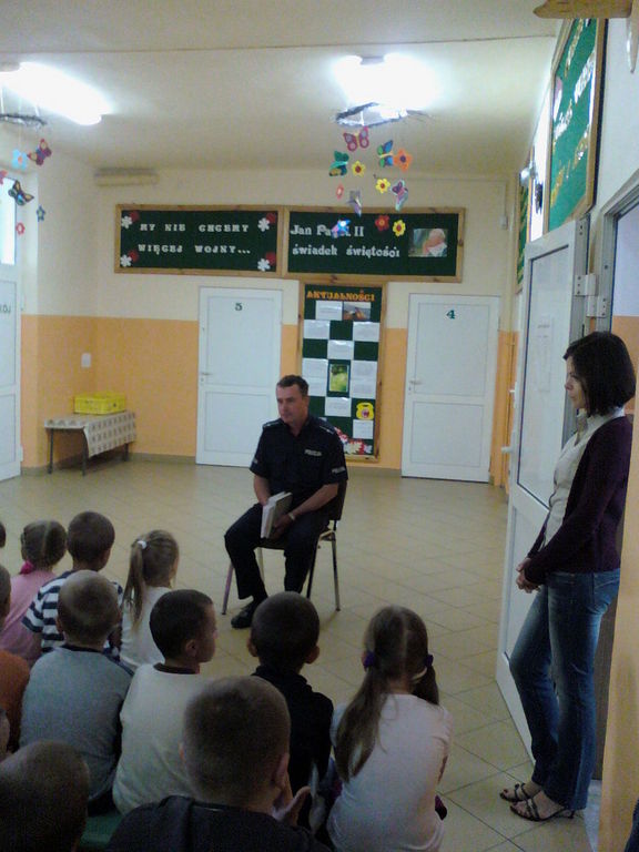 Dużo uwagi poświęcono sprawom bezpieczeństwa. Pan policjant przypomniał dzieciom zasady prawidłowego poruszania się po drodze oraz w jej pobliżu.