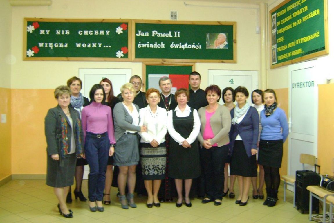 Uczniowie przywitali gościa krótkim montażem słowno-muzycznym. Ksiądz Biskup został obdarowany przez Radę Rodziców i Samorząd Uczniowski kwiatami, którymi dziękowano przybyłemu za trud pracy duszpasterskiej. Rada Pedagogiczna przygotowała niespodziankę w postaci publikacji nawiązującej do historii Ziemi Wyszkowskiej.