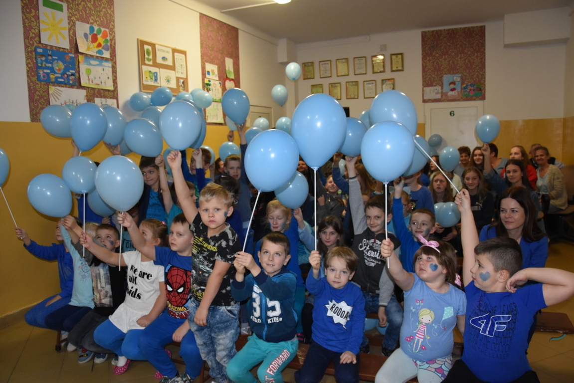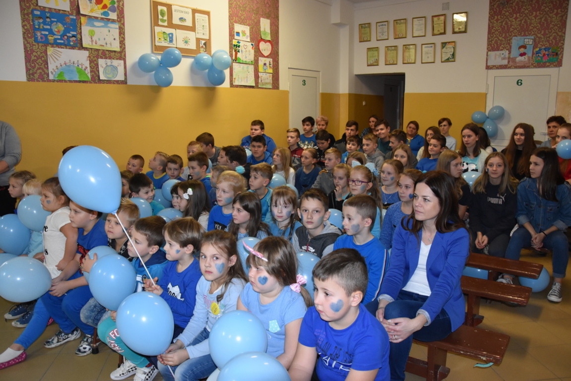 W dniu obchodów uczniowie i nauczyciele przyszli do szkoły ubrani na niebiesko, w młodszych klasach wolontariusze ze szkolnego koła wolontariatu malowali dzieciom niebieskie serduszka,