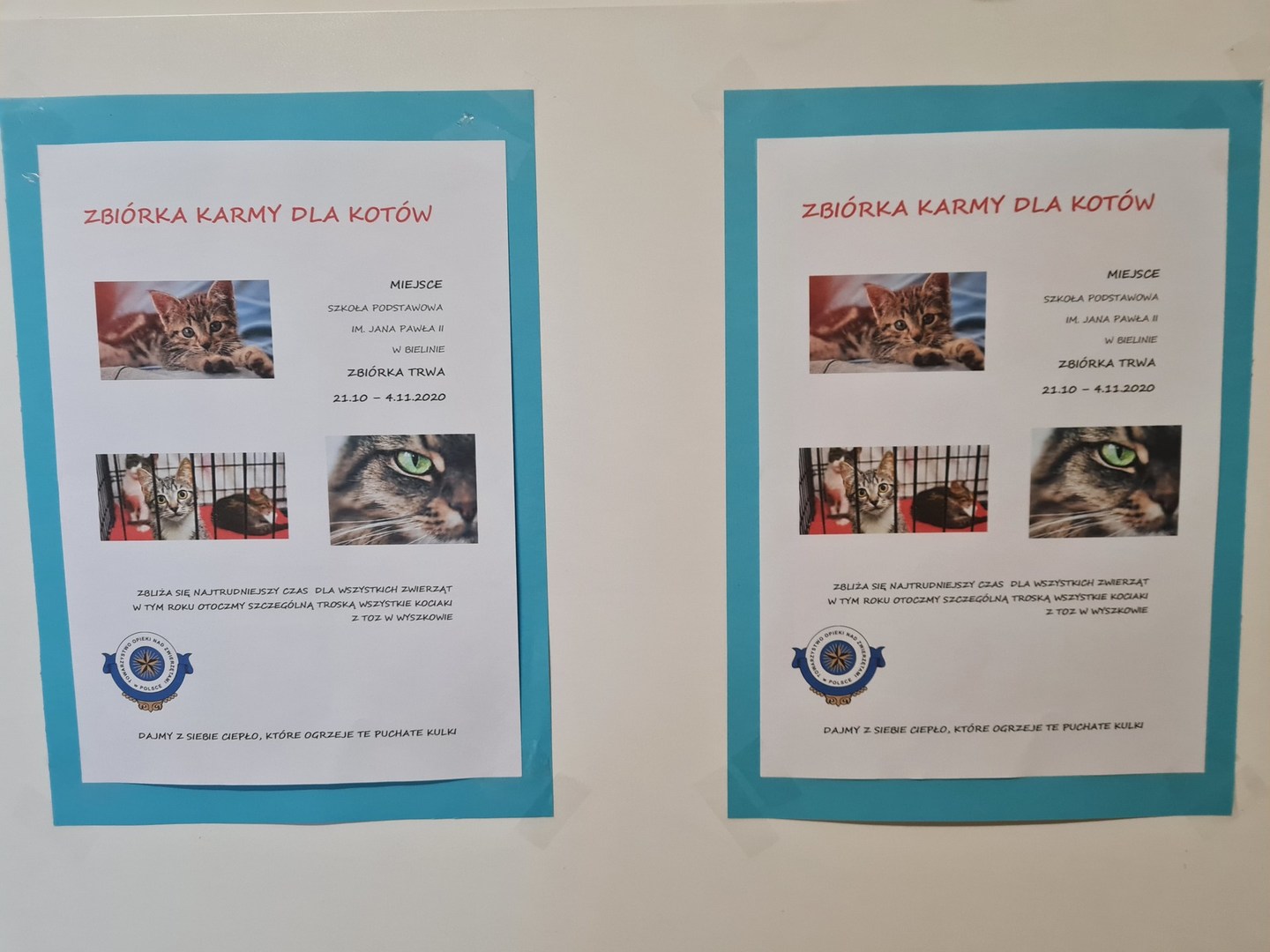W dniach 21.10-04.11.2020r. Samorząd Uczniowski organizuje zbiórkę mokrej karmy i żwirku dla kotów. Zebrane dary zostaną przekazane dla Towarzystwa Opieki nad Zwierzętami w Wyszkowie.