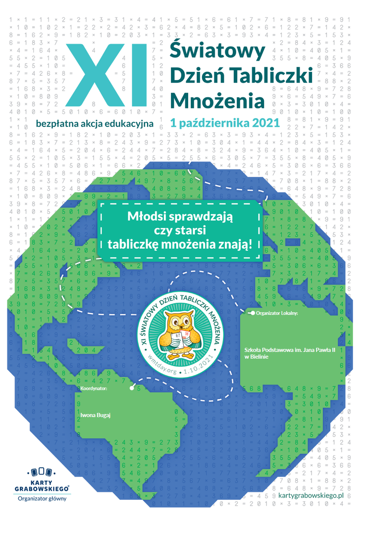 Dnia 1 października 2021 roku obchodziliśmy XI Światowy Dzień Tabliczki Mnożenia. Akcja ta odbywa się co roku w pierwszy piątek października. Ma ona na celu utrwalenie umiejętności szybkiego mnożenia. Tego dnia uczniowie mogą w nietypowy sposób powtórzyć sobie materiał, przyswoić go lub uzupełnić, w zależności od tego, na jakim poziomie znajomości tabliczki mnożenia się znajdują.