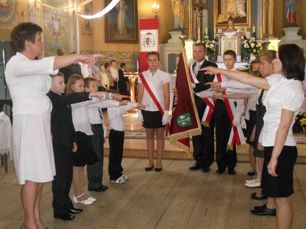 Sztandar został wręczony przez Panią Dyrektor Marię Jadwigę Deptułę pierwszemu pocztowi sztandarowemu w składzie: Chorąży – Konrad Wróbel, Asysta – Wioleta Chodyna i Ewelina Sieńkowska.