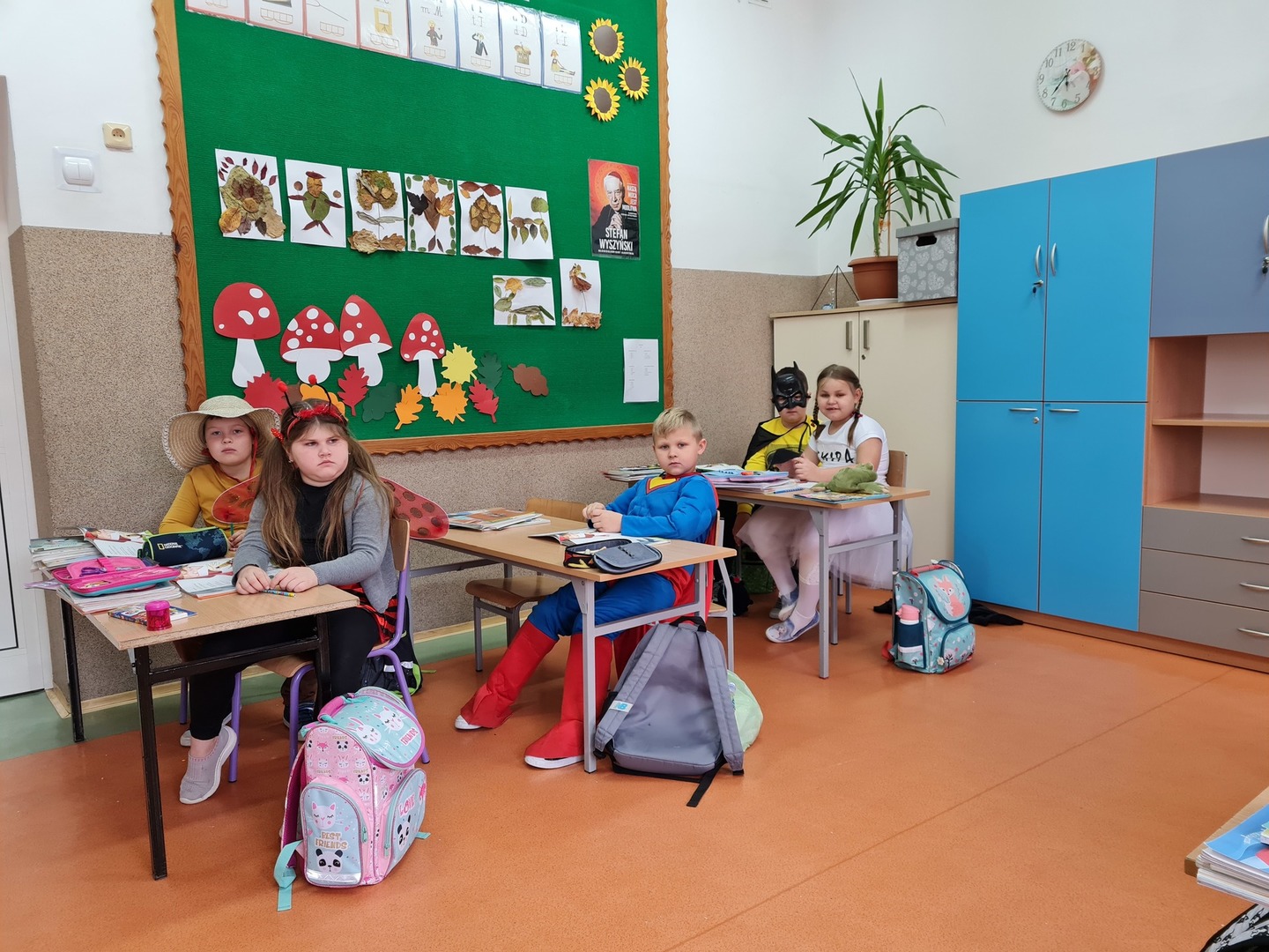 Dzieci z oddziału przedszkolnego i klasy pierwszej przyłączyły się do obchodów Międzynarodowego Dnia Postaci z Bajek, który obchodzony jest 5 listopada. Tego dnia wszyscy byli przebrani za bajkową postać. Uczniowie brali udział w zgadywankach i zabawach związanych z bajkami. Prezentowali przyniesione przez siebie książki i wykonywali do nich ilustracje.