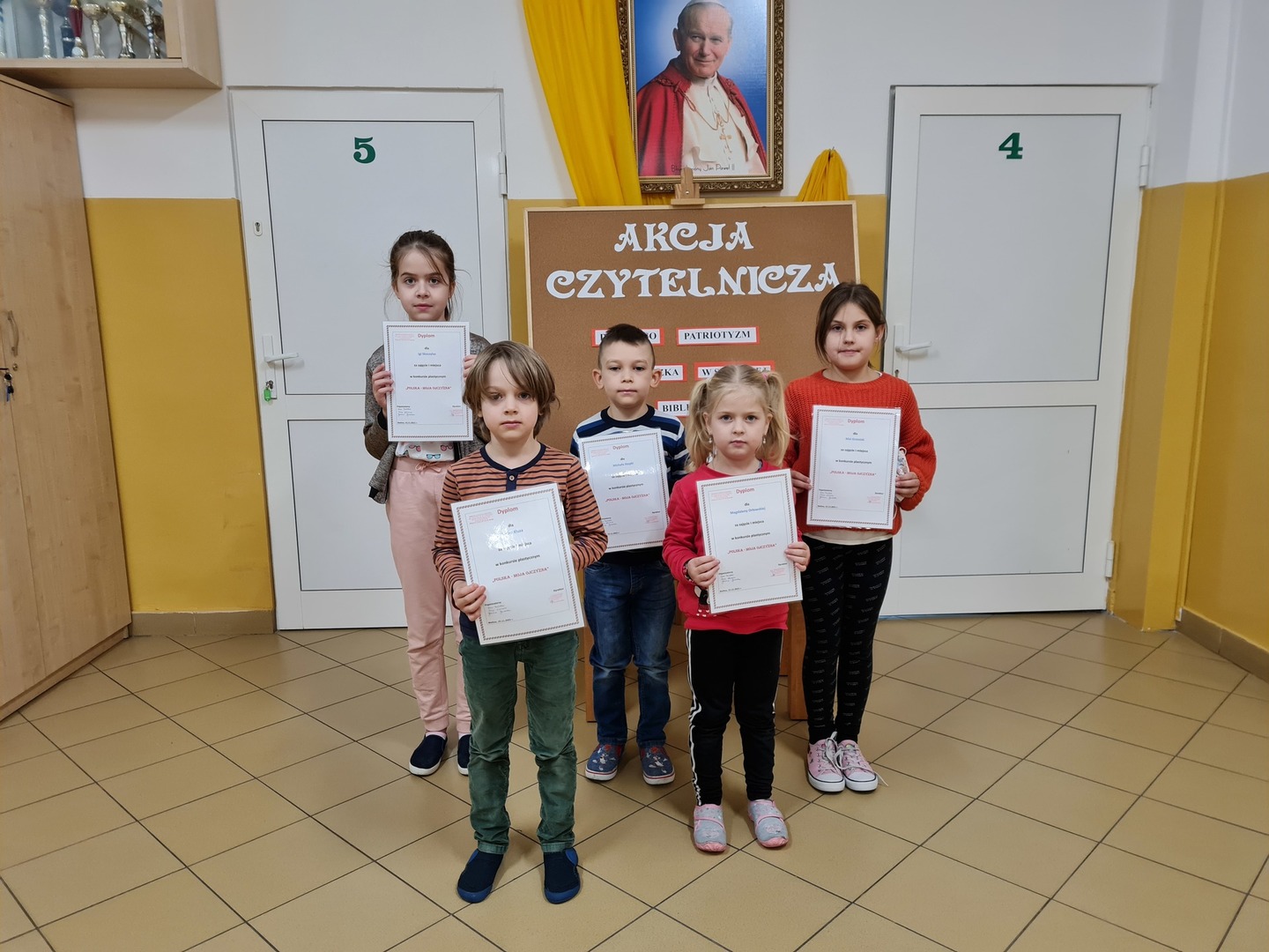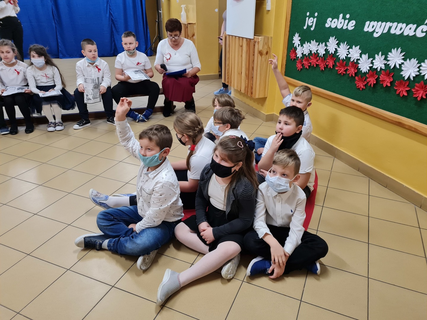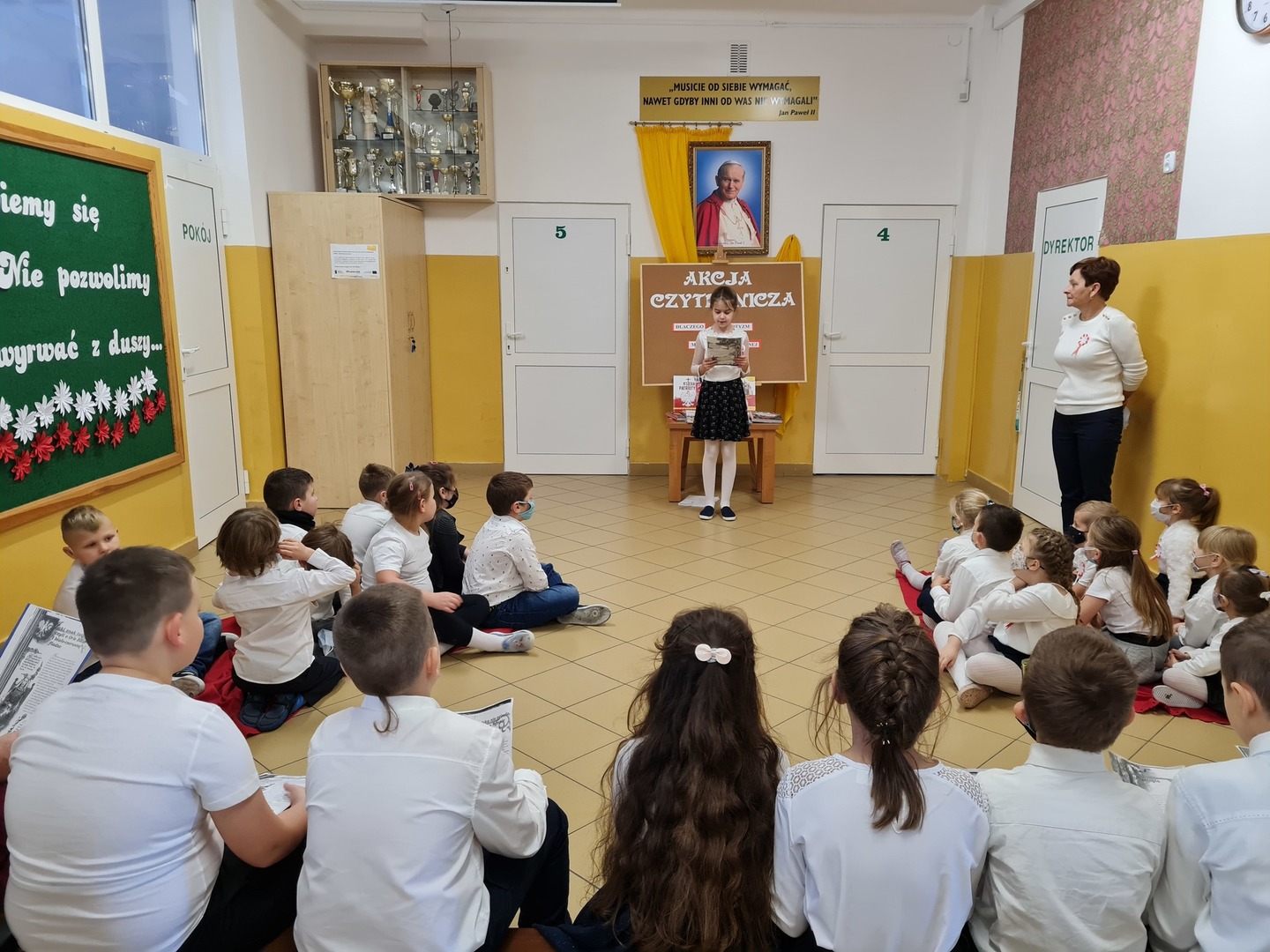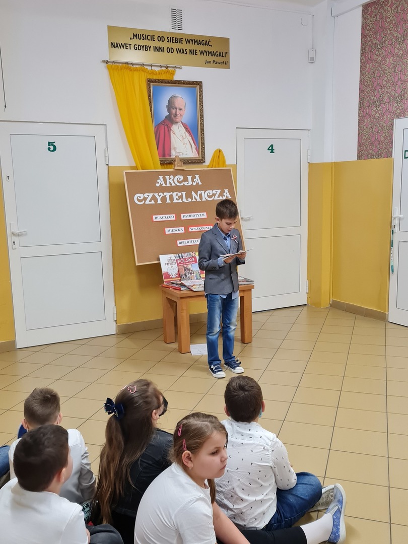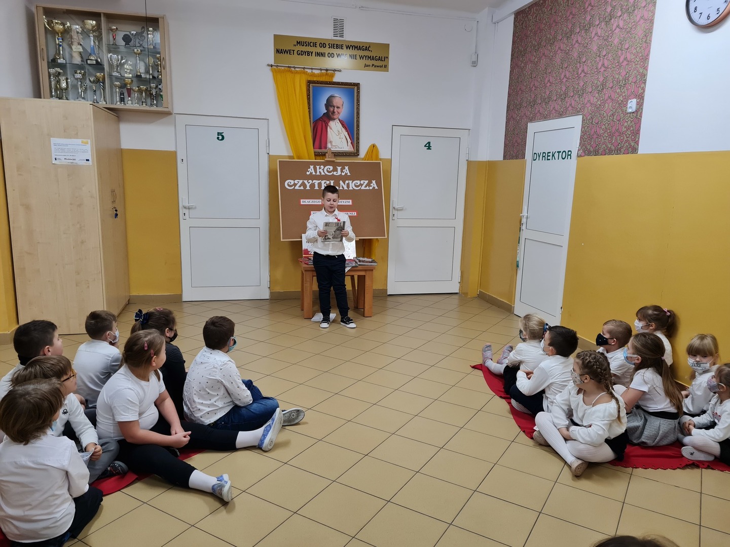 Po ustaleniu odpowiedzi na pytanie zawarte w nazwie akcji,uczniowie klasy II i III przeczytali młodszym dzieciom fragmenty książek, związane z dziejami naszej ojczyzny.