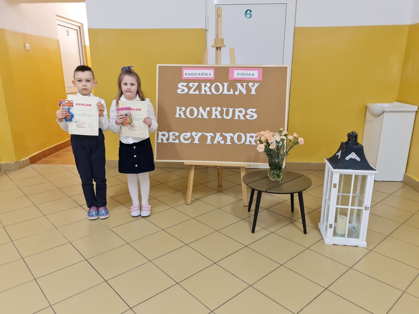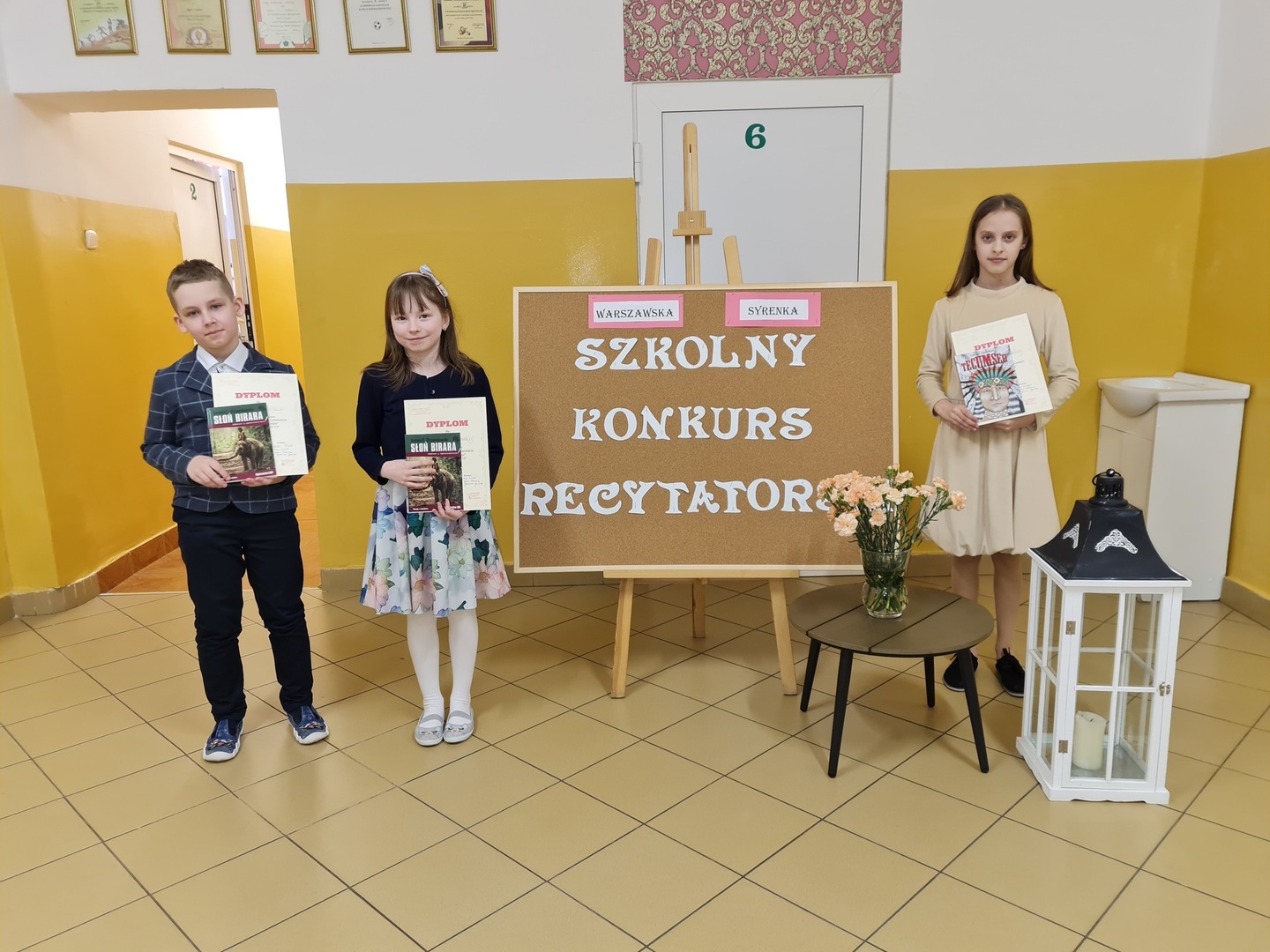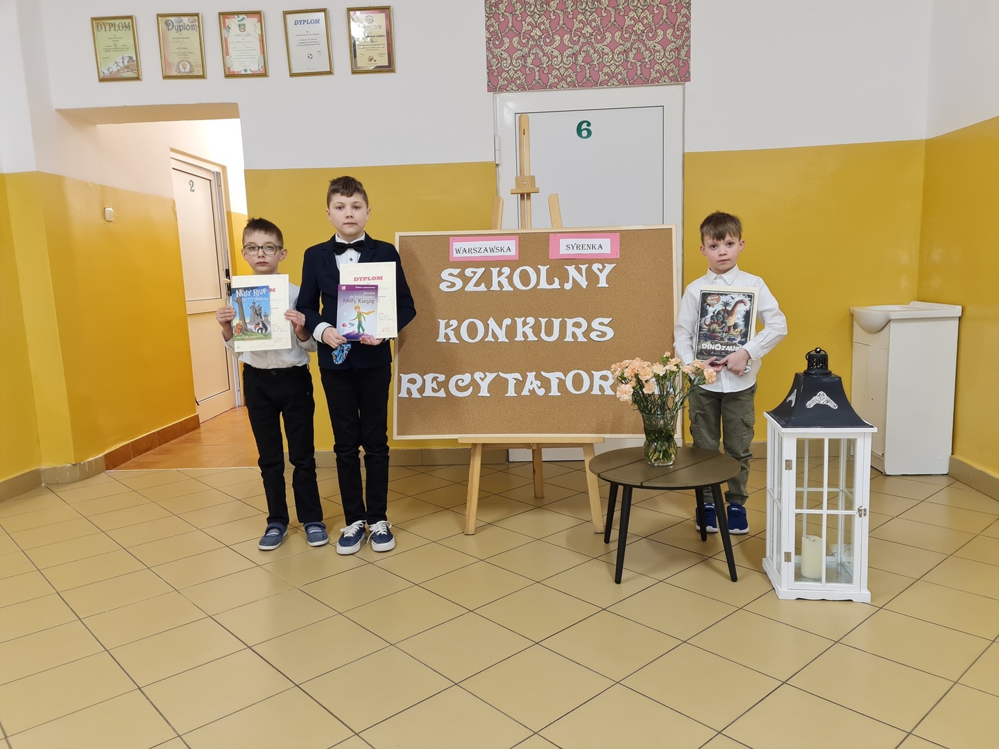 14 marca odbył się w naszej szkole konkurs recytatorski "Warszawska Syrenka" w trzech kategoriach. W kategorii uczniów klas 0-3 1 miejsce zajął uczeń klasy 3 Wojciech Dziadak,który recytowal wiersz Marcina Brykczyńskiego "Biały niedźwiedź ", 2 miejsce Maksymilian Godlewski, z wierszem Marii Konopnickiej "Rzeka", 3 - Marcel Godlewski z wierszem Jana Brzechwy "Smok". Wyróżnieni zostali przedszkolaki Zuzanna Dziadak i Michał Stopka. W kategorii klas 4-6 1 miejsce zajęła Karolina Baranowska, z wierszem Władysława Belzy "Modlitwa polskiego dziewczęcia", 2 - Oskar Nowicki, z wierszem "Legenda o warszawskiej Syrence" Zbigniewa Dmitrocy, 3- Maja Sienkowska, która recytowała wiersz Agnieszki Frączek "Stluczka ".W kategorii klas 7-8 1 miejsce otrzymala Zuzanna Grzesiak za wiersz "Do Matki Polki" Adama Mickiewicza. Wyróżnieni recytatorzy otrzymali nagrody książkowe i dyplomy. Będą oni reprezentować naszą szkołę na konkursie gminnym. Pozostali uczestnicy zostali nagrodzeni dyplomami.