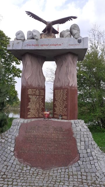 Wykonali zdjęcie pomnika z polskim orłem i listą zamordowanych. Na którym widnieje napis:,,NIE DAJMY ZGINĄĆ POLEGŁYM”