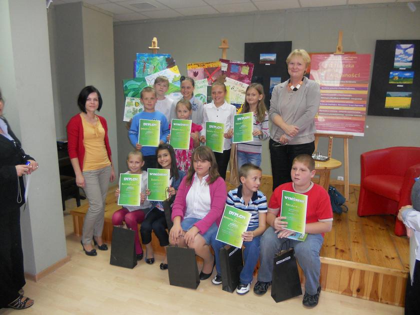 Uczniowie klasy pierwszej naszej szkoły zdobyli nagrody w konkursie plastycznym „Wszystkie barwy zieleni”, organizowanym przez Miejsko – Gminną Bibliotekę Publiczną w Wyszkowie. Laureaci: Sebastian Walos i Klaudia Kowalska wraz z wychowawcą Anną Ponichterą, zostali zaproszeni na spotkanie z autorką książek dla dzieci Panią Barbarą Gawryluk oraz na uroczyste wręczenie nagród.