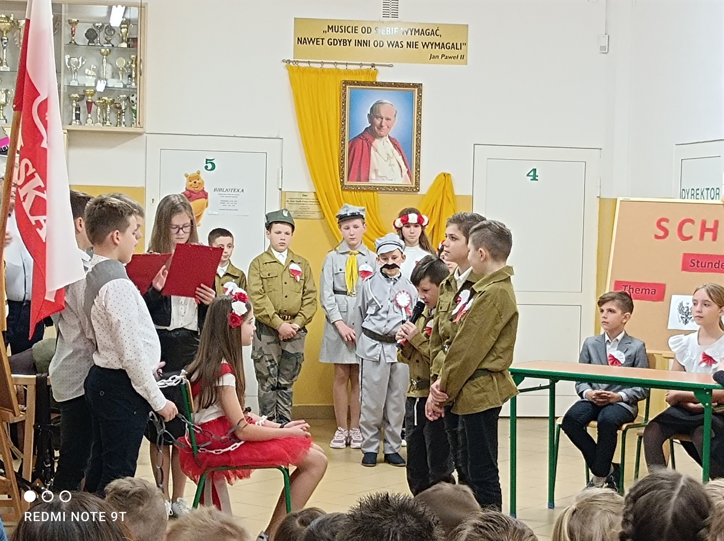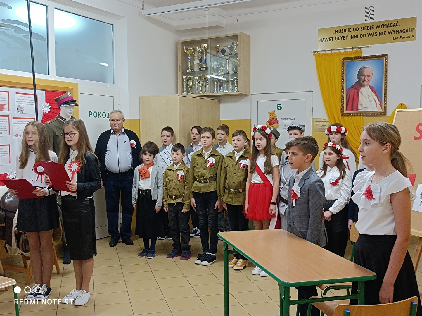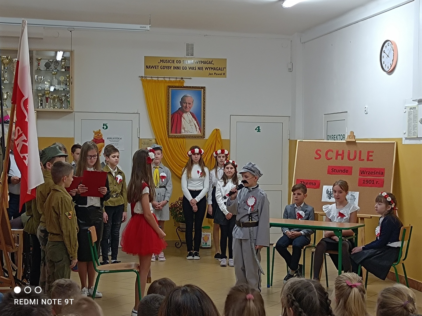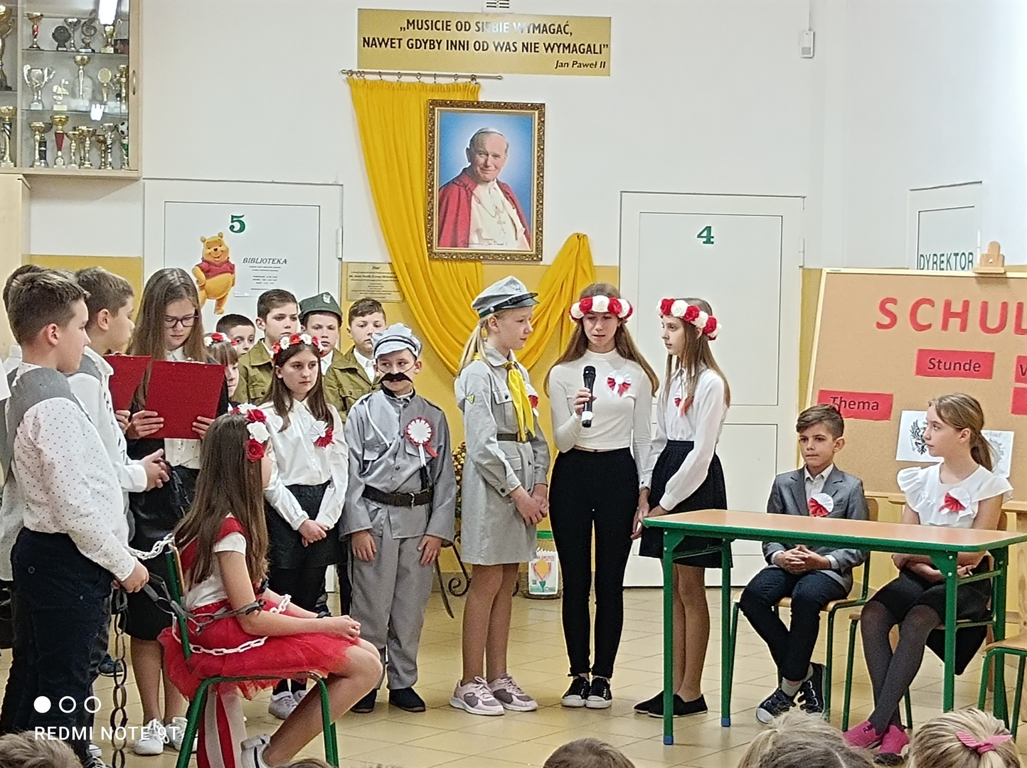 W poniedziałek 14 listopada w naszej szkole obchodziliśmy Narodowe Święto Niepodległości. Uczniowie klas IV – VI przygotowali montaż słowno - muzyczny upamiętniający 104 rocznicę odzyskania przez Polskę niepodległości. Akademia rozpoczęła się uroczystym odśpiewaniem naszego hymnu „Mazurka Dąbrowskiego”. Następnie uczniowie przypomnieli tragiczną historię narodu polskiego i trudną drogę do wolności, wcielając się w postaci zaborców, powstańców, żołnierzy, a także bohaterskich dzieci z Wrześni. Zaprezentowali krótkie scenki przybliżające historyczne okoliczności tych ważnych wydarzeń, starali się oddać nastroje Polaków walczących w obronie kraju. Recytując wiersze i śpiewając pieśni patriotyczne, wyrazili swoją miłość do Ojczyzny.
