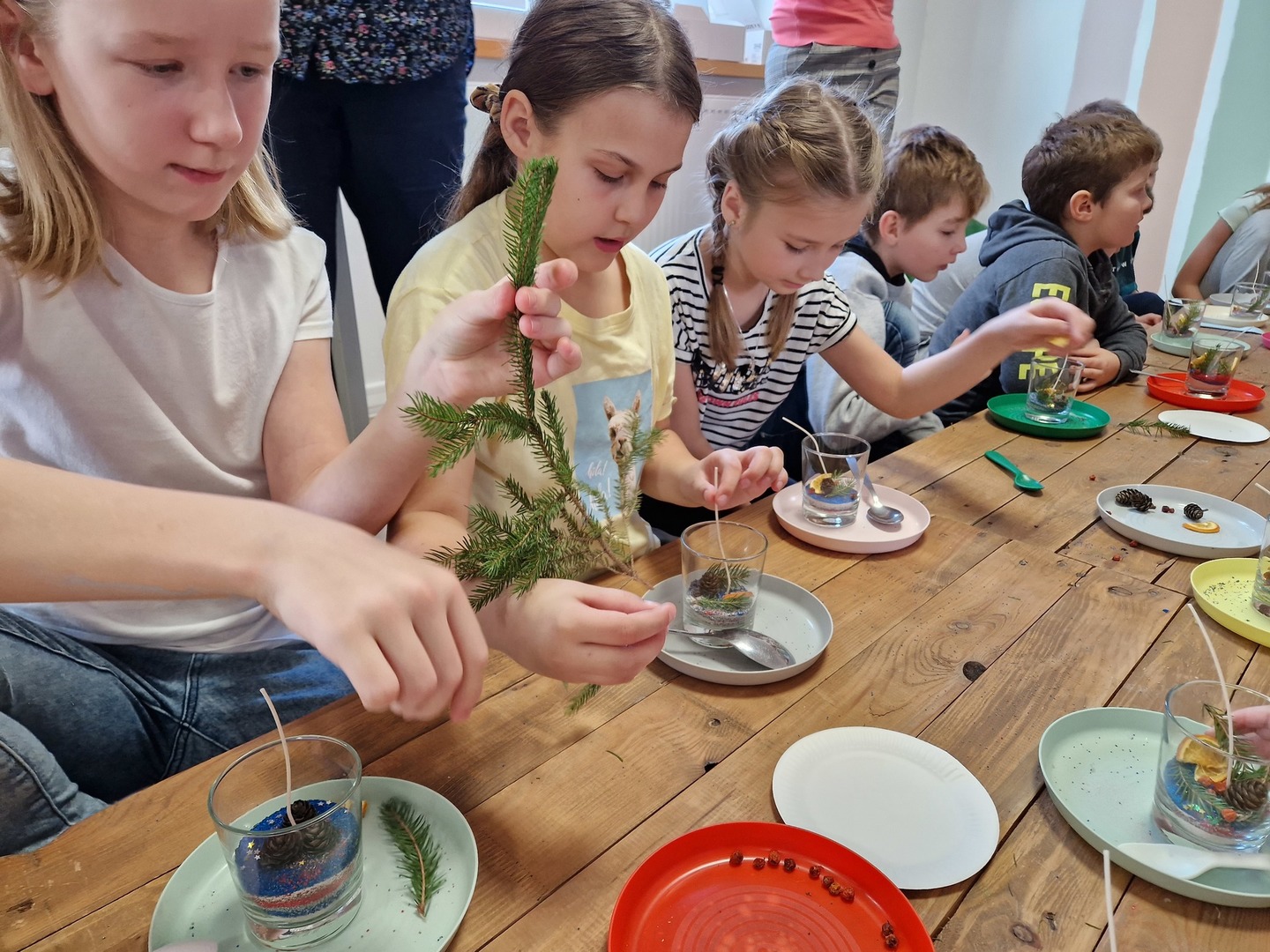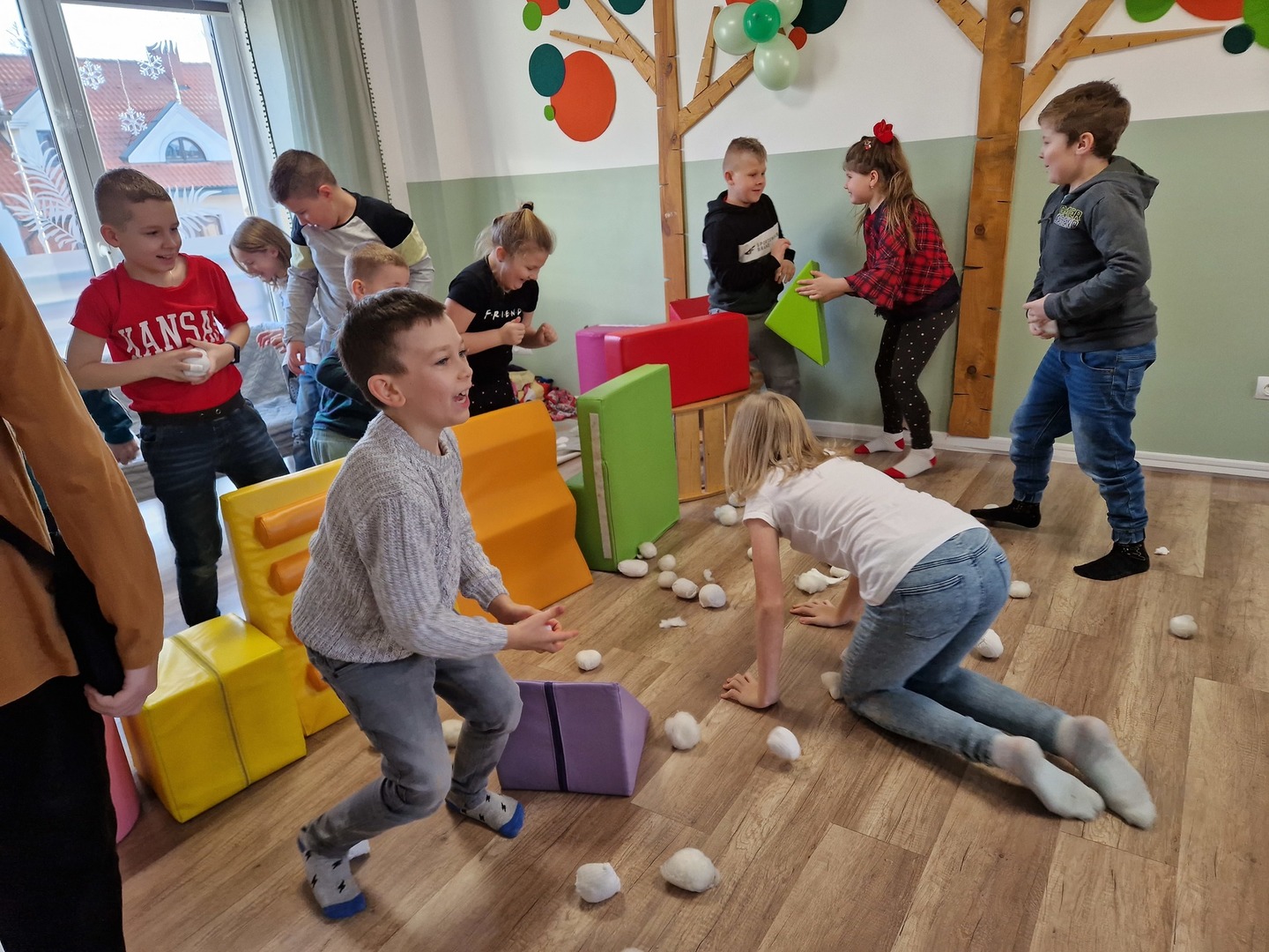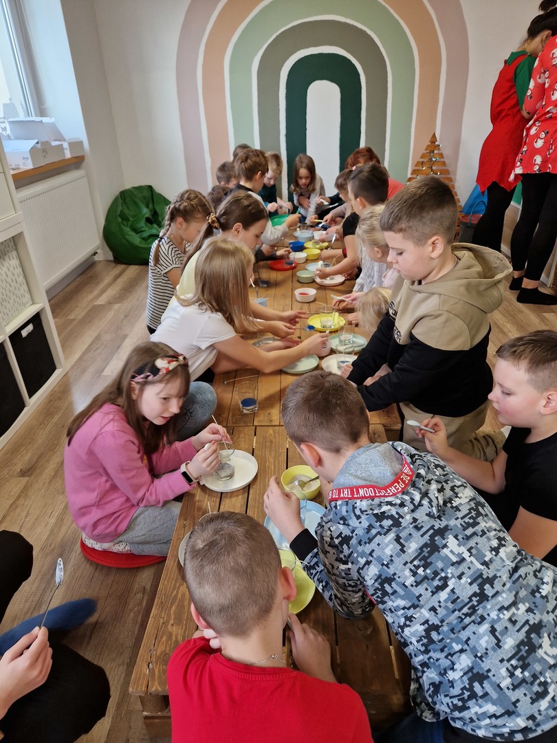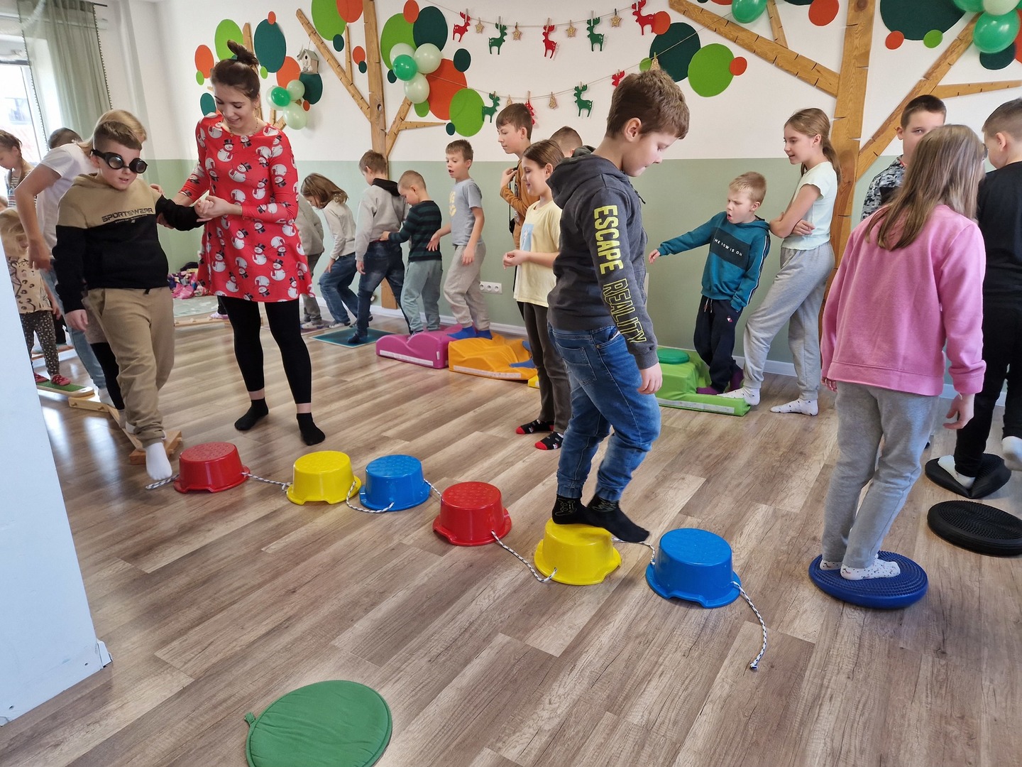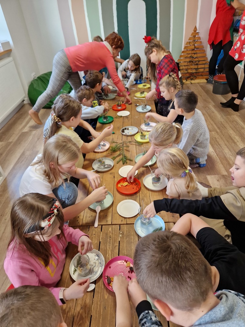 8 grudnia dzieci z klas 0-III i kilkoro uczniów klas starszych wzięło udział w warsztatach świątecznych, które odbyły się w Polanie dla dzieci w Wyszkowie. Na początek dzieci wzięły udział w zabawach integracyjnych: śnieżne zaprzęgi, taniec z chustami na lodzie, poszukiwanie marchewek dla reniferów i rozmowach na temat świąt i prezentów. Kolejnym punktem programu było wykonanie świec żelowych z wykorzystaniem piasku, kawałków pomarańczy, świerkowych gałązek i kolorowych cekinów. Każdy mógł sobie wybrać, jakiego zapachu użyje do swojej świecy (dla niektórych osób był to niełatwy wybór). Najtrudniejszy był okres wyczekiwania na zastygnięcie wosku. Na szczęście został on wypełniony kolejną porcją szalonych zabaw. Należały do nich m. in.: trasa przez przeszkody w okularach imitujących złożone oczy i bitwa na śnieżki. Na koniec dzieci wzięły stworzone przez siebie świece, aby zapalić je przy świątecznym stole i wyruszyły na posiłek do restauracji McDonald’s. To był krótki, ale intensywnie spędzony czas.