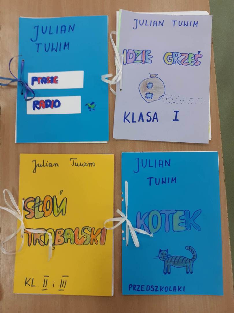 Uczniowie klas 0-3 poznawali twórczość Juliana Tuwima. Na zajęciach bibliotecznych wykonali do wybranego wiersza ilustracje i tworzyli swoje klasowe książki. Byli bardzo zaangazowani, a potem chętnie oglądali wytwory swojej pracy. Celem akcji bylo promowanie czytelnictwa oraz zachęcenie uczniów do sięgnięcia po twórczość Juliana Tuwima.
