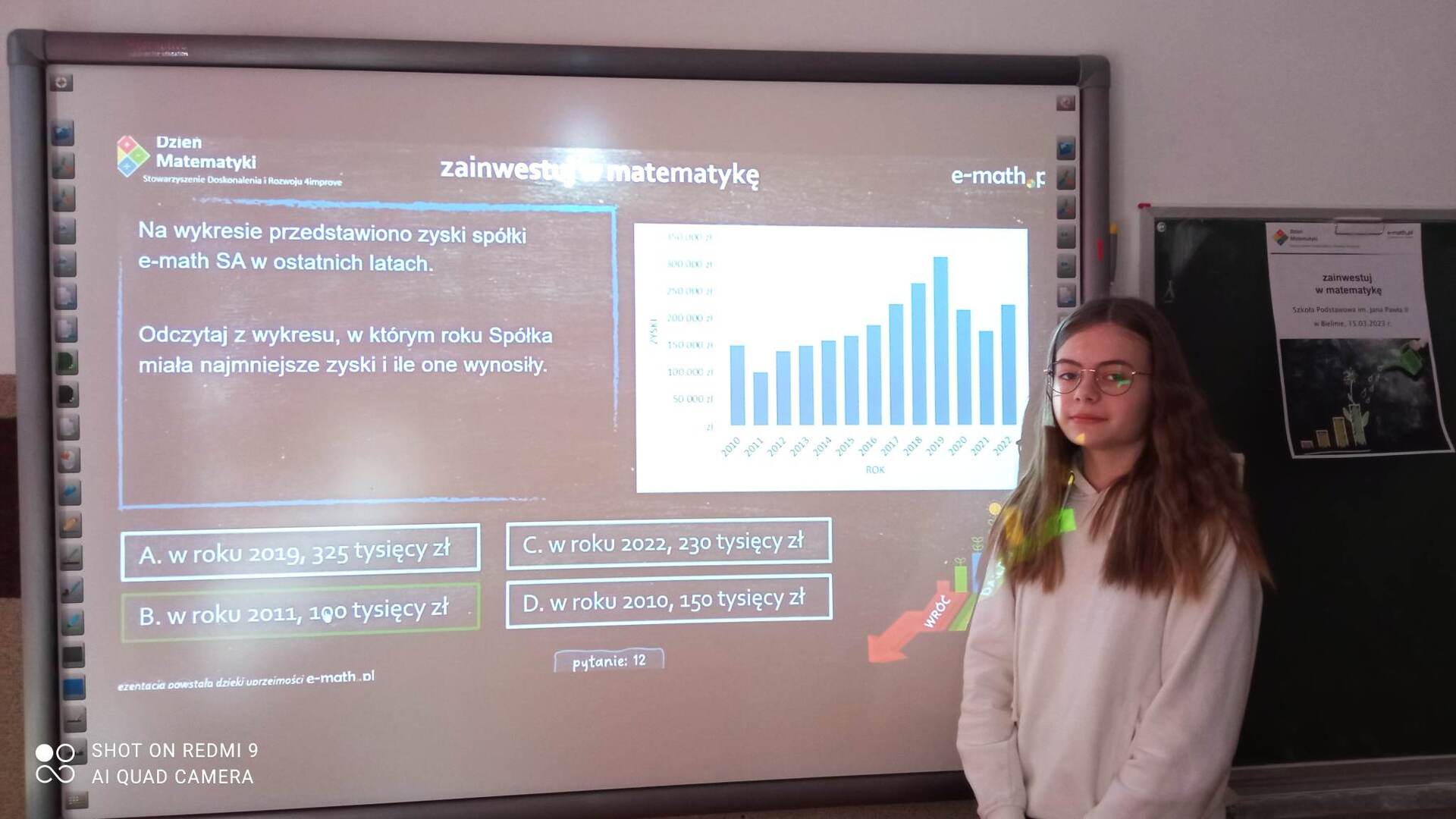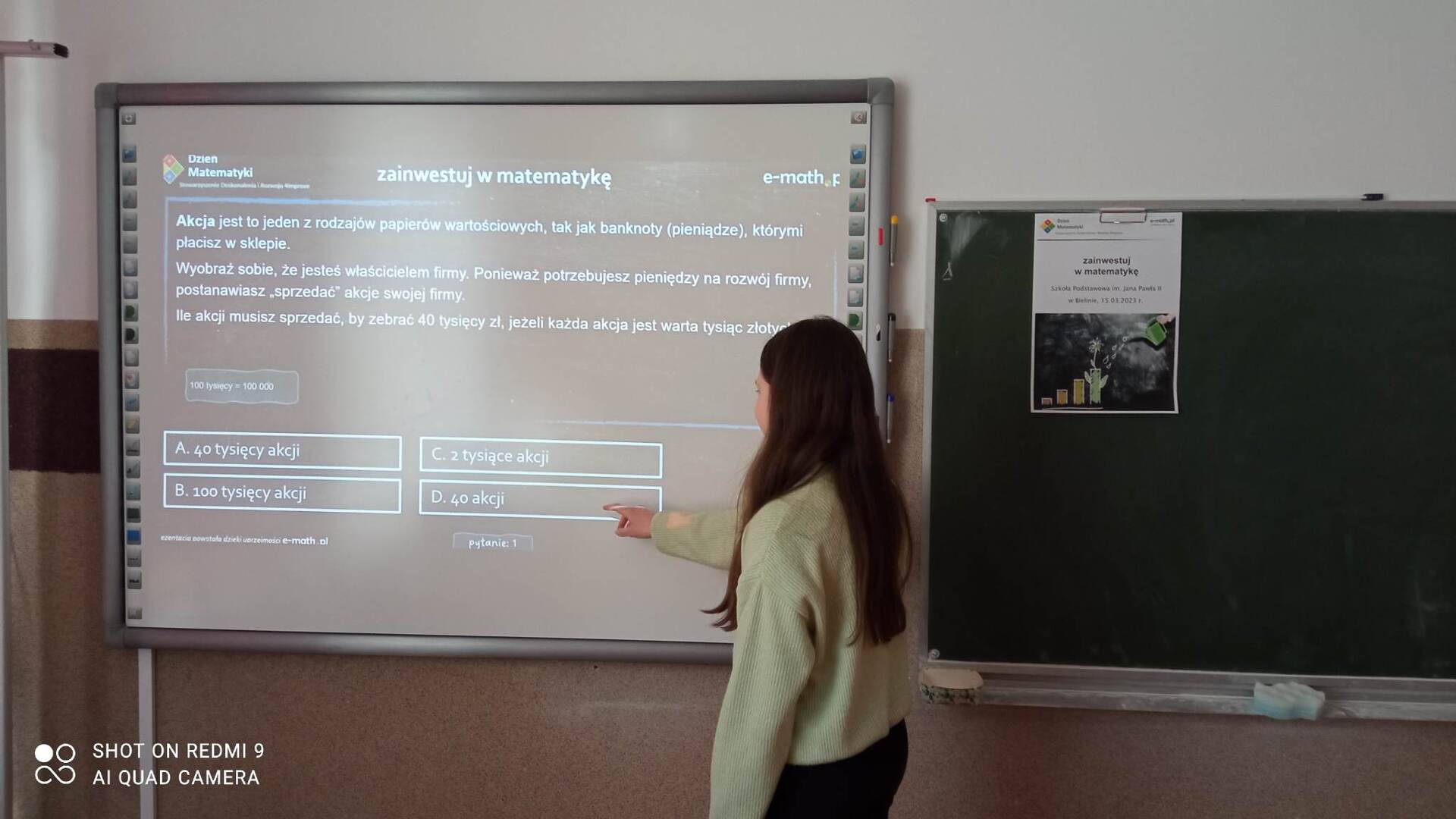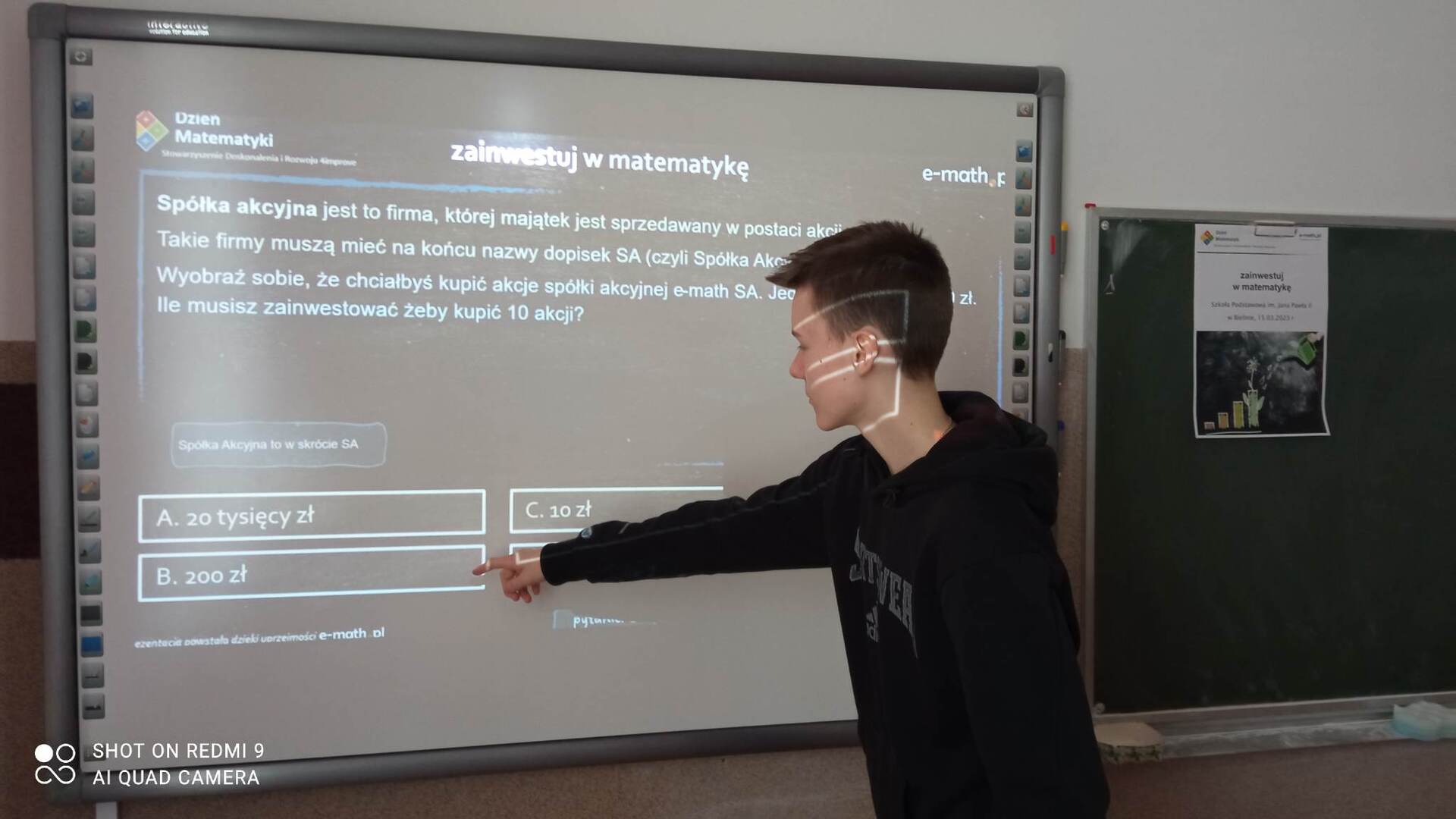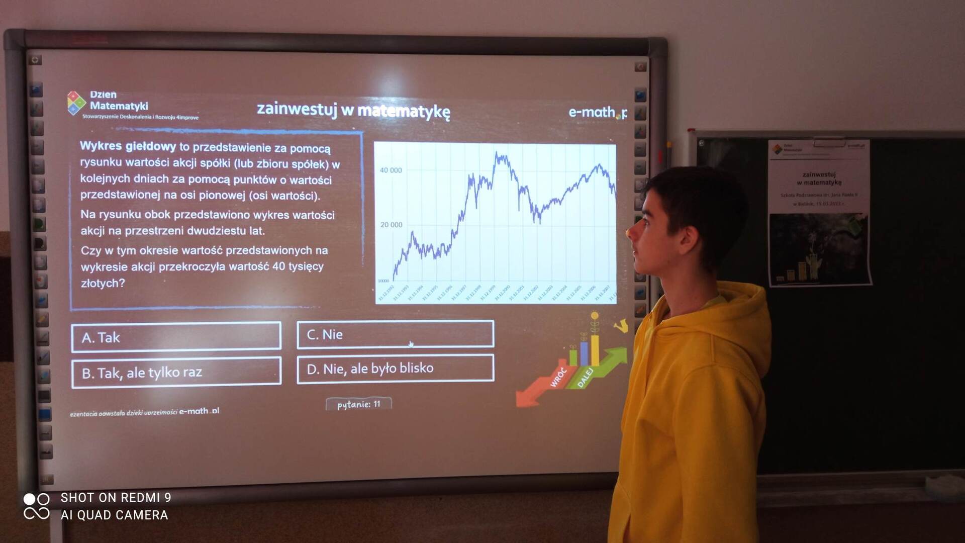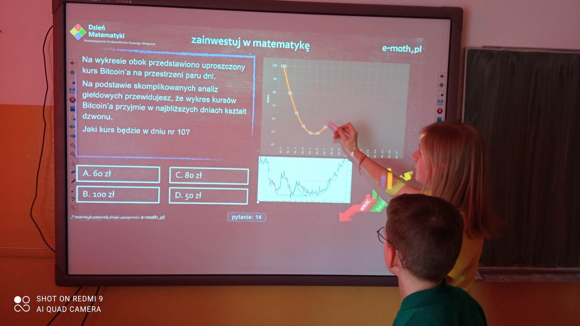 W marcu 2023 roku w naszej szkole odbył się Ogólnopolski Dzień Matematyki pod hasłem "Zainwestuj w matematykę". Wydarzenie to kierowane jest do przede wszystkim do tych, którzy nie lubią matematyki. Tego dnia uczniowie klas IV-VIII rozwiązywali zadania o tematyce ekonomicznej, przygotowane w formie prezentacji multimedialnej. Konkurs miał sprawić przyjemność, a nie być kolejnym testem. Zadania nie wymagały wybitnej wiedzy matematycznej – wystarczył otwarty umysł i chęć do zabawy matematyką. Dzień Matematyki dał uczniom trochę odmiany w nauce matematyki. Udział w grach i zabawach matematycznych miał na celu pokazać jasną stronę tej nauki.