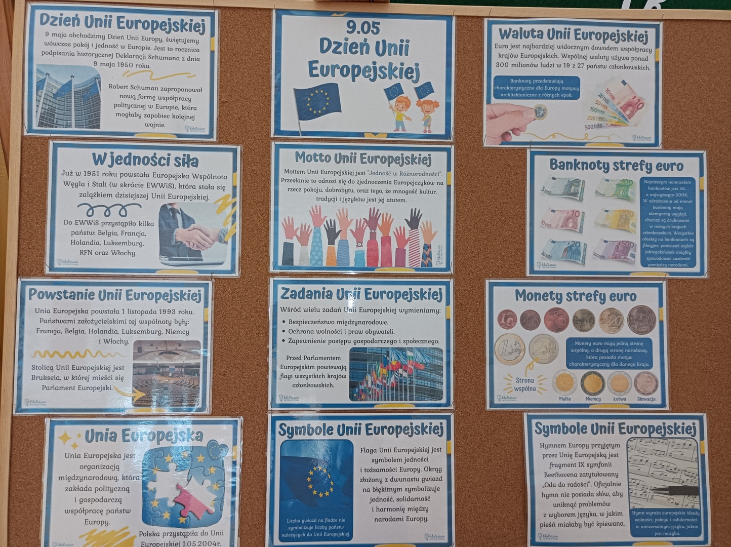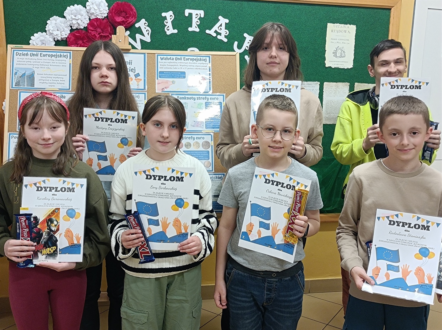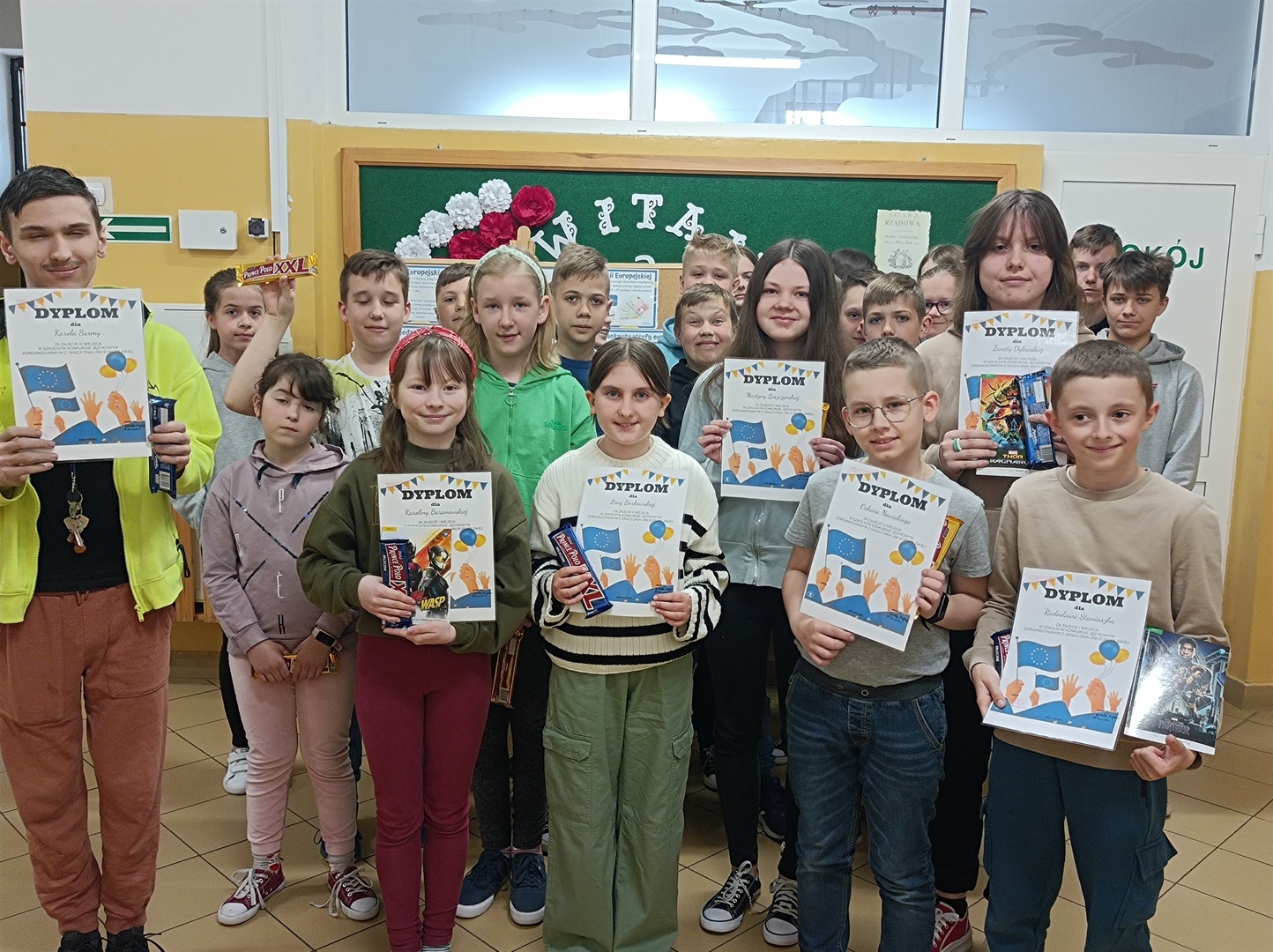 9 maja jest dniem, w którym co roku wszystkie kraje europejskie świętują pokój i jedność. W tym właśnie dniu przypada rocznica podpisania historycznej „deklaracji Schumana”. Tradycyjnie uczniowie naszej szkoły włączyli się do obchodów tego dnia. Nadrzędnym założeniem lekcji okolicznościowych było propagowanie patriotyzmu do naszej ojczyzny Polski, by uczniowie czuli się Europejczykami, ale by wiedzieli co nas odróżnia od innych narodów i co możemy wnieść z naszego dziedzictwa kulturowego do wspólnoty państw europejskich. Uczniowie klas IV-VIII wzięli udział w Szkolnym Konkursie Językowym.