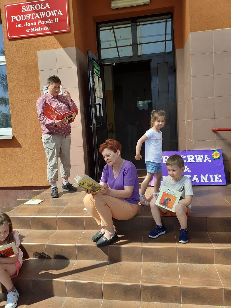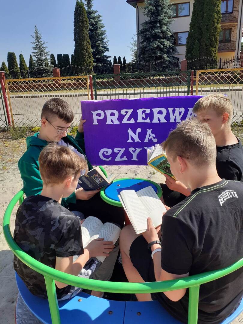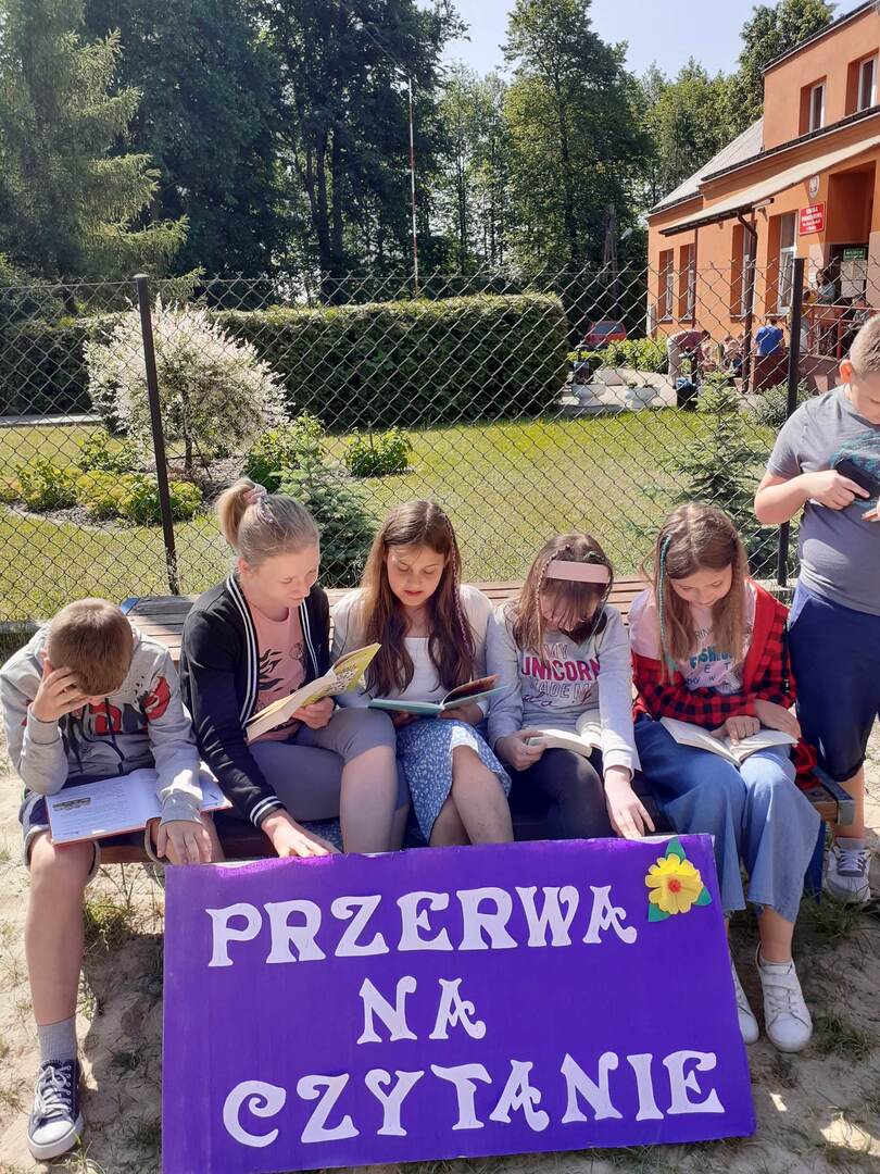 Dnia 5 czerwca w naszej szkole zorganizowana została akcja czytelnicza pt. " Przerwa na czytanie". Jest to ogólnopolska akcja polegająca na biciu rekordu w liczbie osób czytających na przerwie. W wydarzeniu wzięła udział cała społeczność szkoły, wszyscy uczniowie, nauczyciele, pracownik administracji, panie woźne. Celem akcji jest promocja czytelnictwa wśród dzieci i młodzieży, integracja środowiska lokalnego oraz zachęcenie uczniów do sięgania po książkę w każdej sytuacji i w każdym miejscu.