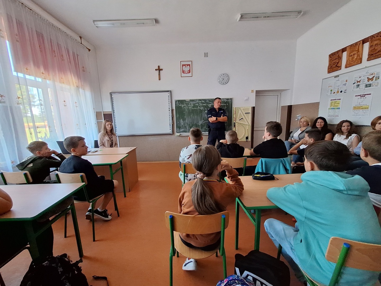Druga część spotkania poświęcona była dla uczniów klas IV-VIII. Również podczas tego spotkania zostały omówione zasady bezpiecznego poruszania się podczas drogi do szkoły. Rozmowa dotyczyła także skutków agresywnych zachowań, nękania i zażywania środków odurzających oraz picia alkoholu.