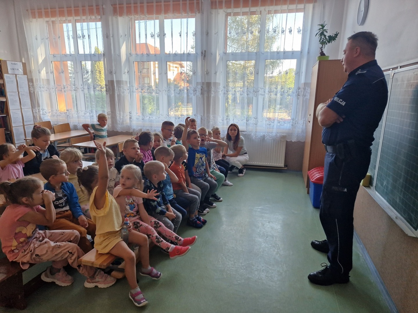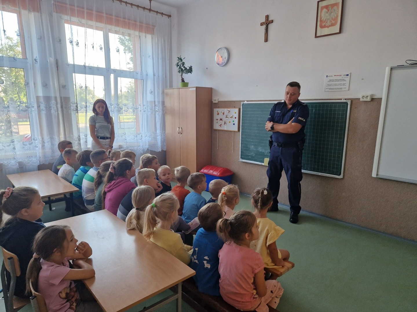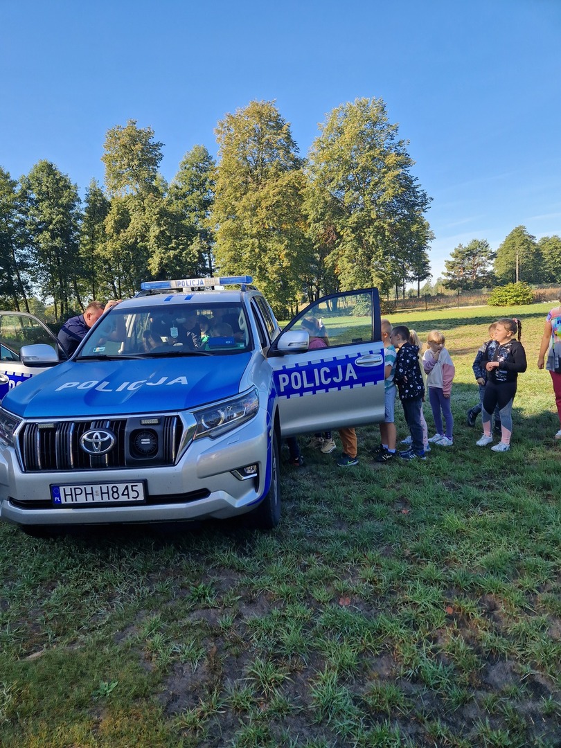 20 września uczniowie naszej szkoły mieli możliwość porozmawiać z dzielnicowym panem Piotrem Kowalewskim. Celem spotkania było zwrócenie uwagi na bezpieczeństwo w czasie drogi do szkoły, korzystania z przejść dla pieszych, sygnalizacji świetlnej, jazdy rowerem. Dzieci z oddziału przedszkolnego i klas I-III chętnie zadawały pytania dotyczące pracy policjanta. Największą atrakcją okazał się policyjny radiowóz, do którego każdy miał możliwość wejść.