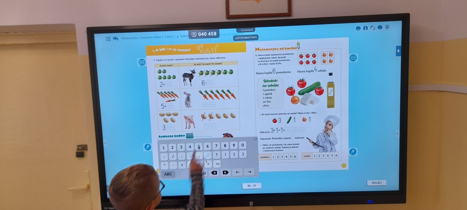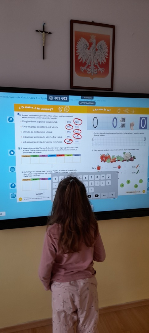 Sala lekcyjna klasy pierwszej została wyposażona w interaktywny monitor dotykowy, który podniósł nie tylko atrakcyjność zajęć, ale również efektywność przyswajania wiedzy. Uczniowie mogą śledzić poprawne pisanie wprowadzanej litery i liczby oraz wykonywać ćwiczenia interaktywne. Korzystanie z pomocy wizualnych sprawia, że uczniowie są bardziej skupieni na zadaniach. Praca z monitorem zwiększa zaangażowanie i entuzjazm uczniów podczas lekcji.