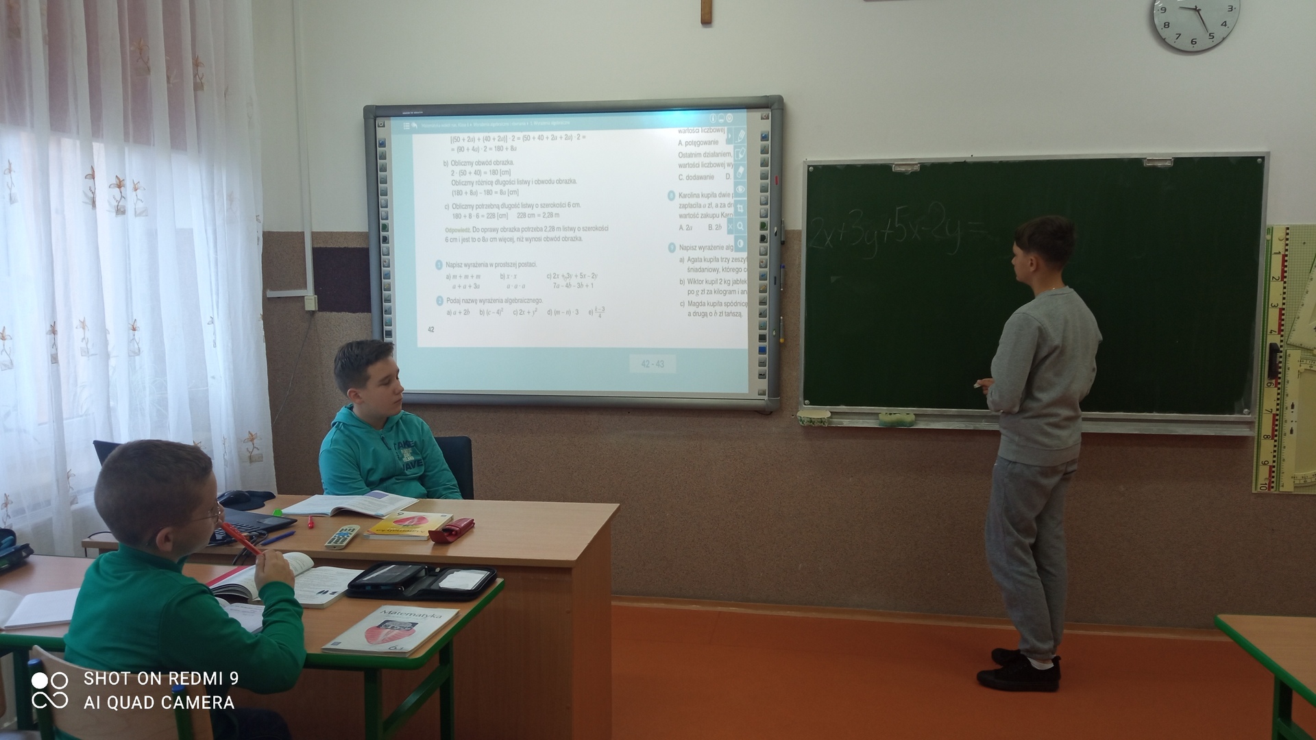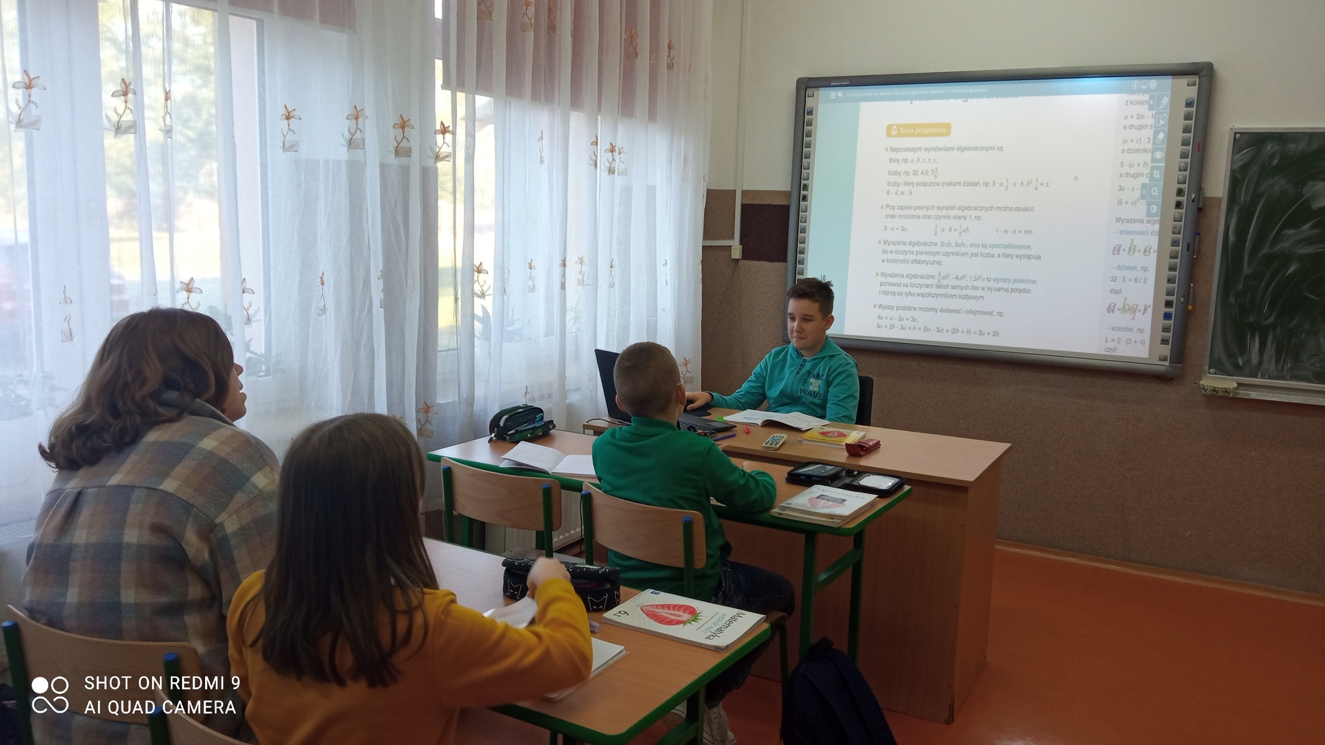 W październiku w klasie VI odbyła się nietypowa lekcja matematyki, w której uczeń stanął po drugiej stronie biurka i wcielił się w rolę nauczyciela. Po uprzednim wprowadzeniu przez nauczyciela w to, jak powinna wyglądać lekcja, jakie elementy powinna zawierać, uczeń przygotował i przeprowadził zajęcia na temat wyrażeń algebraicznych. Lekcja przygotowana i przeprowadzona przez kolegę spotkała się z dużym entuzjazmem pozostałych uczniów. Taka forma realizacji zajęć wzbudziła bardzo duże zainteresowanie całej klasy.