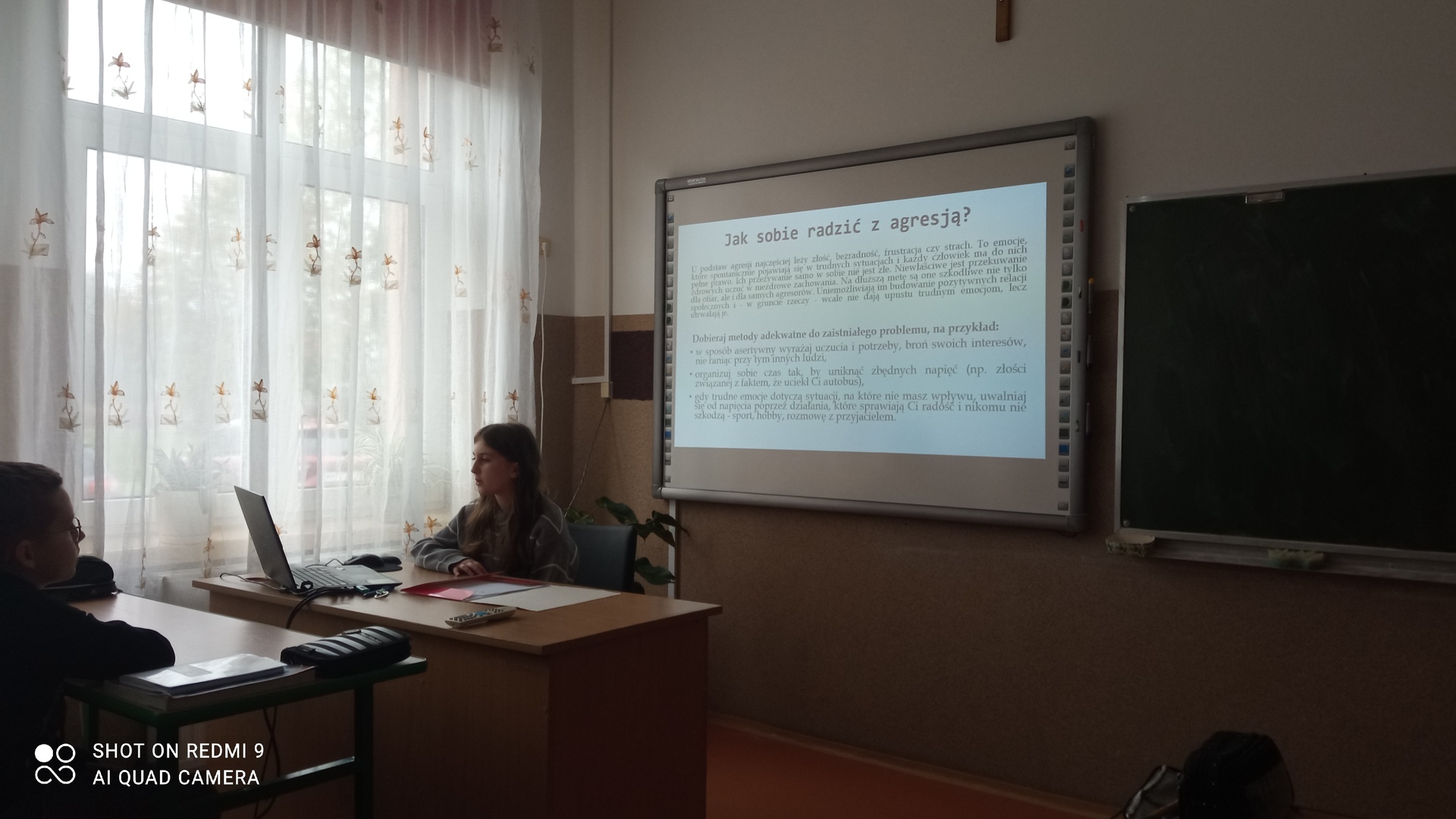 24 października w klasie VI odbyła się lekcja prowadzona przez uczennicę klasy VI dotycząca agresji oraz przemocy. W ramach lekcji uczniowie obejrzeli film: „Stop agresji, stop przemocy” oraz prezentację multimedialną: „Jak sobie radzić z agresją i przemocą?”. Taka forma prowadzenia lekcji pomogła uczniom w zrozumieniu, że są aktywnymi uczestnikami swojej szkolnej społeczności i że mają wpływ na kształtowanie pozytywnego otoczenia.
