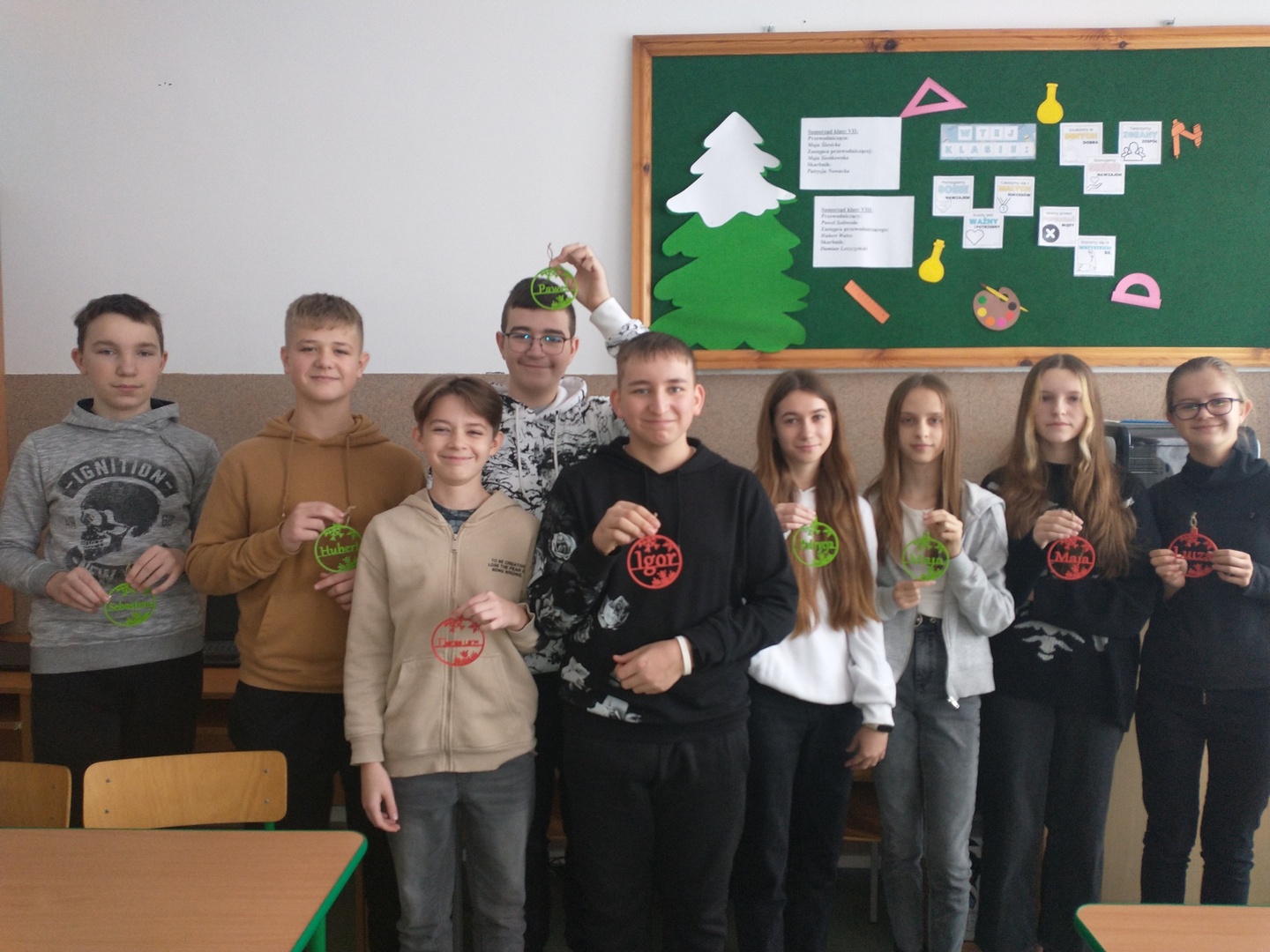 Młodzież z klasy VII i VIII przed nadchodzącymi Świętami Bożego Narodzenia po raz ostatni wspólnie ozdobiła swoją klasę. Jednym z elementów dekoracji były bombki z imionami uczniów obu klas i ich wychowawczyni, wykonane przy użyciu drukarki 3D. #LaboratoriaPrzyszłości