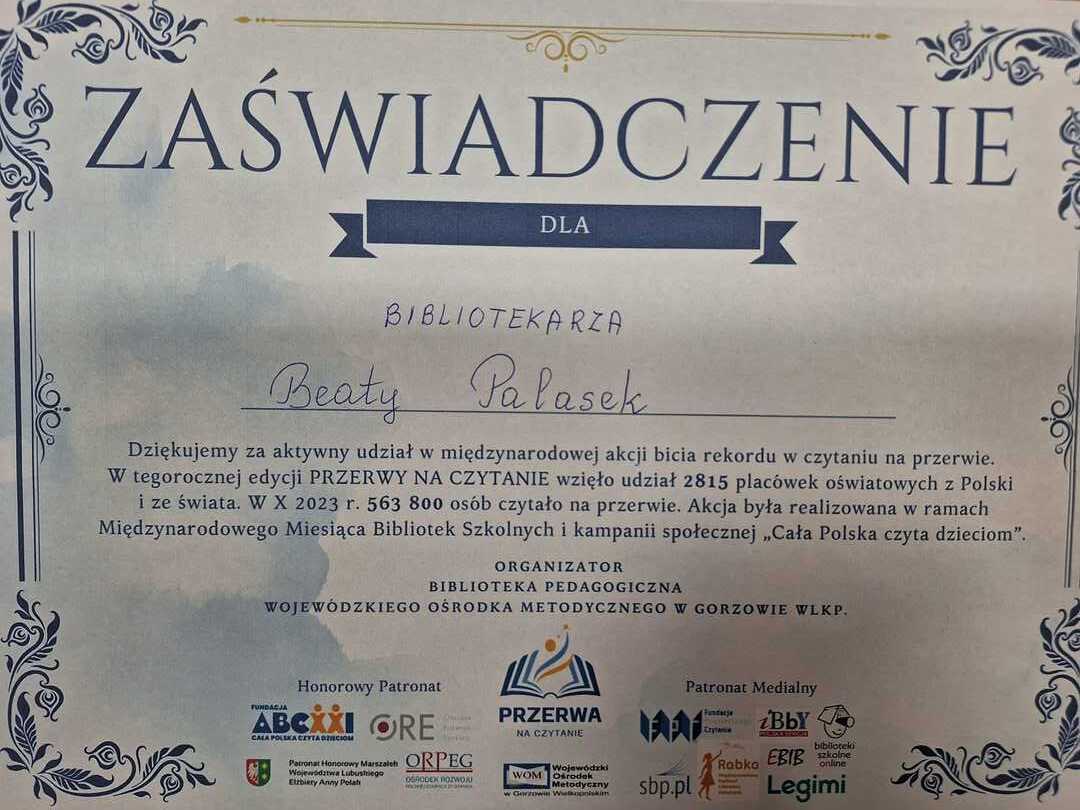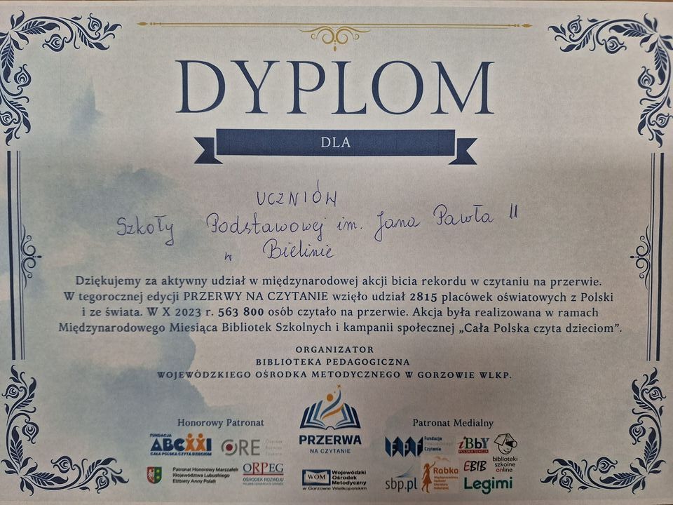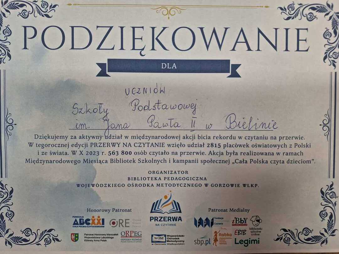 Otrzymaliśmy dyplom i podziękowanie za udział w międzynarodowej akcji bicia rekordu w czytaniu na przerwie, w której brali udział wszyscy uczniowie, nauczyciele i rodzice naszej szkoły. Dziękujemy wszystkim za udział w tej akcji.