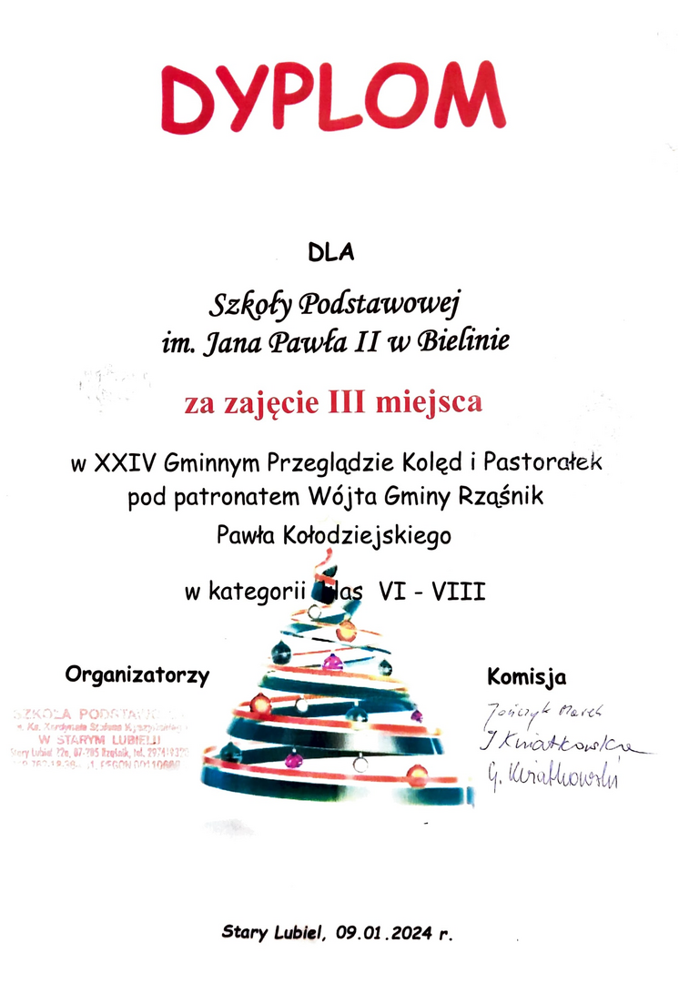 8 stycznia odbył się Gminny Przeglad Kolęd i Pastorałek w Lubielu Starym. Z naszej szkoły wystąpili w kategorii A Wiktor Baranowski i Wiktor Osowiecki z kolędą "Skrzypi wóz" otrzymali 3 miejsce. W kategorii B Marcel Godlewski I Artur Kluz zaprezentowali pastoralkę "Od serca do ucha". W kategorii C Oskar Nowicki wystąpił z pastoralką "Gloria" zajął 3 miejsce. Wszyscy uczestnicy otrzymali dyplomy i nagrody. Dzieci przygotowały do konkursu Panie: Beata Palasek, Anna Ponichtera i Dorota Nawrocka. Gratulujemy wszystkim uczestnikom wspaniałych występów. Dziękujemy też Rodzicom, którzy kibicowali swoim dzieciom.