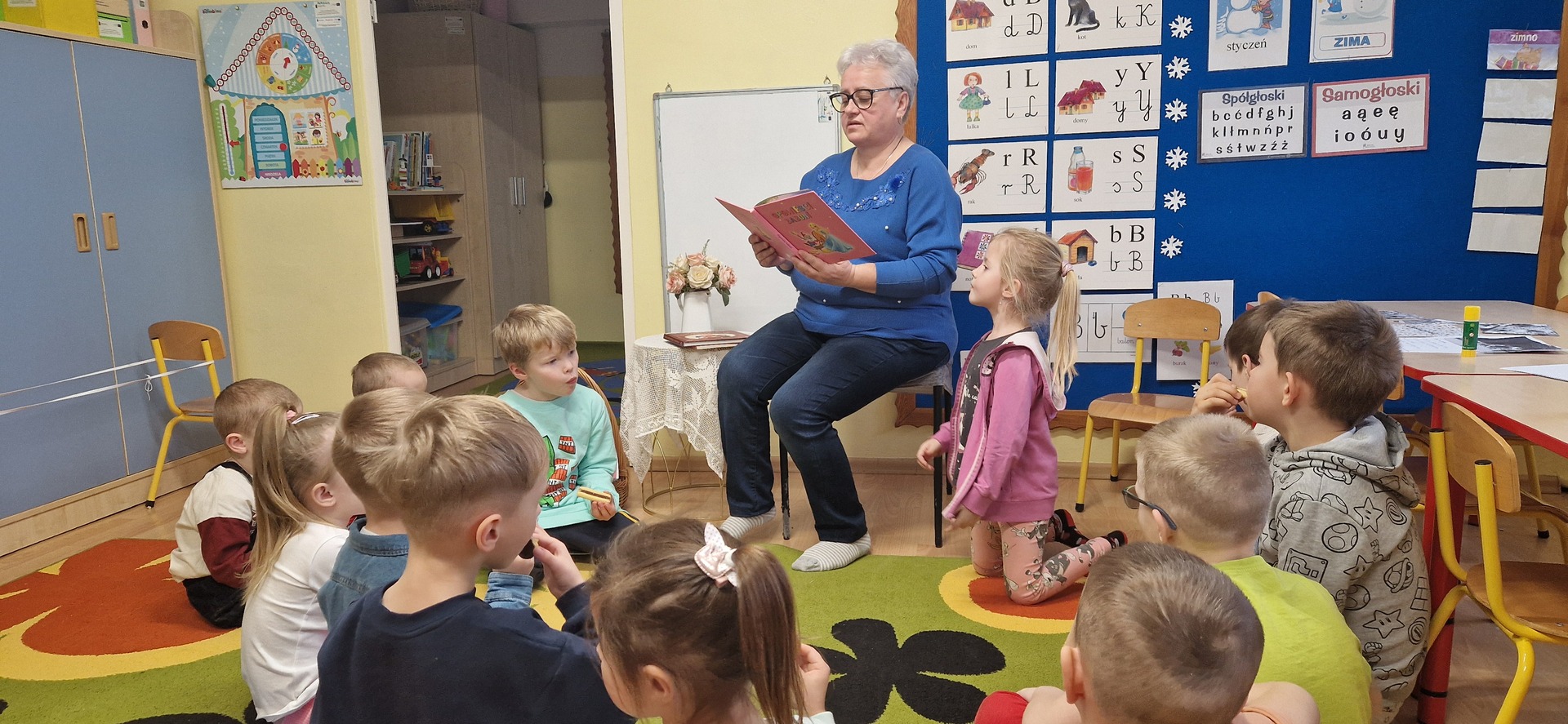 Oddział przedszkolny odwiedziła dziś Pani Wiesia, babcia Asi, aby przeczytać nam bajeczkę i opowiedzieć o zabawach swojego dzieciństwa. Czytanie zachwyciło dzieci i naszego misia Edzia .