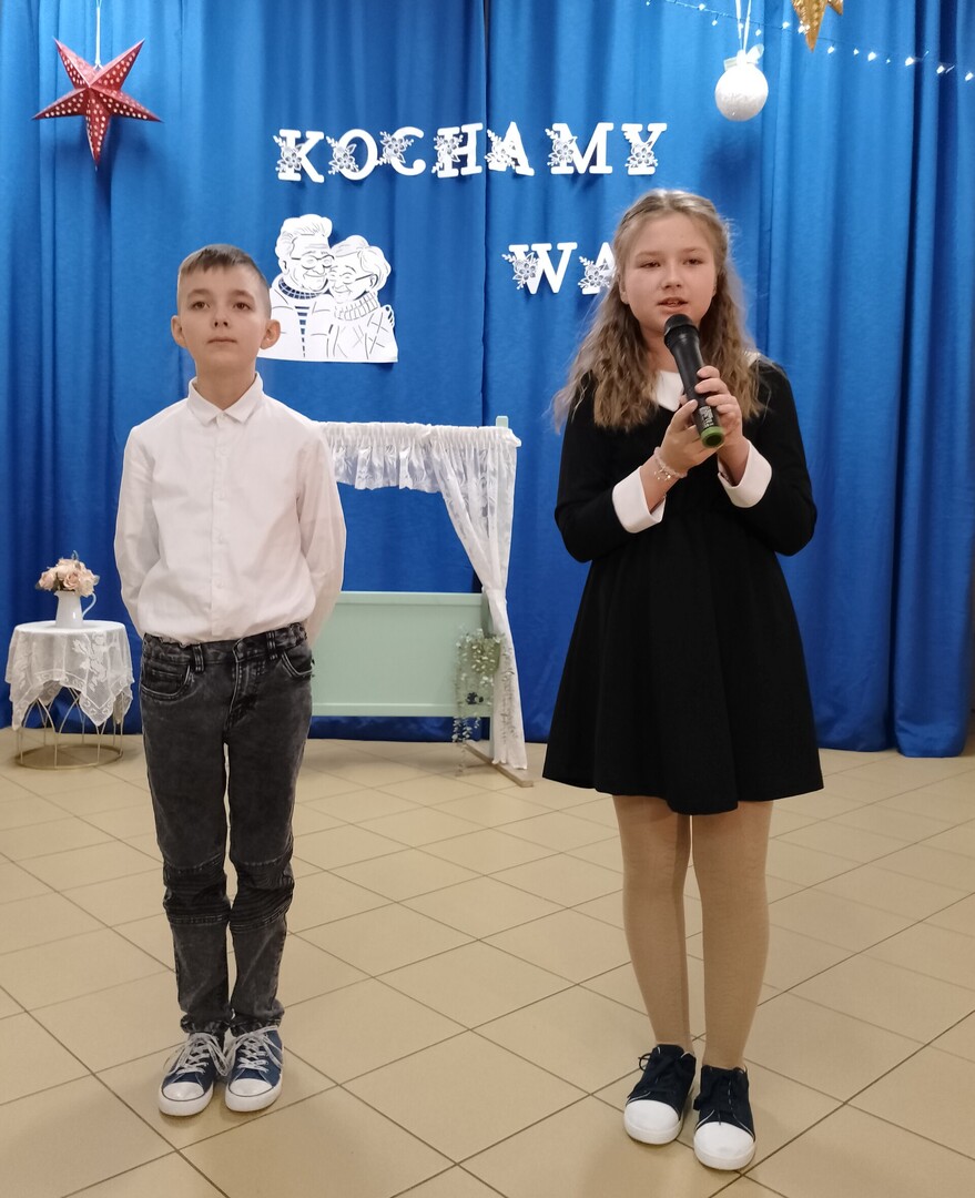 08.02.2024r. odbyła się w naszej szkole uroczystość z okazji Dnia Babci i Dziadka. Pani Ewelina Gąsiewska - Krystosik przywitała tak zacnych gości słowami pełnymi szacunku i złożyła im najserdeczniejsze życzenia. Podkreśliła, że zawsze będą skarbnicą wiedzy dla swoich wnuków. W części artystycznej swoje umiejętności zaprezentowały dzieci z oddziału przedszkolnego oraz klas I-IV. Dziadkowie z dumą mogli podziwiać występy taneczne, humorystyczne scenki, wiersze i piosenki. Mogli też obejrzeć teleturniej rodzinny "Familiada", którego głównymi bohaterami były drużyny babci i dziadka. Po zaśpiewaniu głośnego "Sto lat", uczniowie wręczyli swoim gościom własnoręcznie wykonane upominki. Część oficjalna zakończyła się słodkim poczęstunkiem.