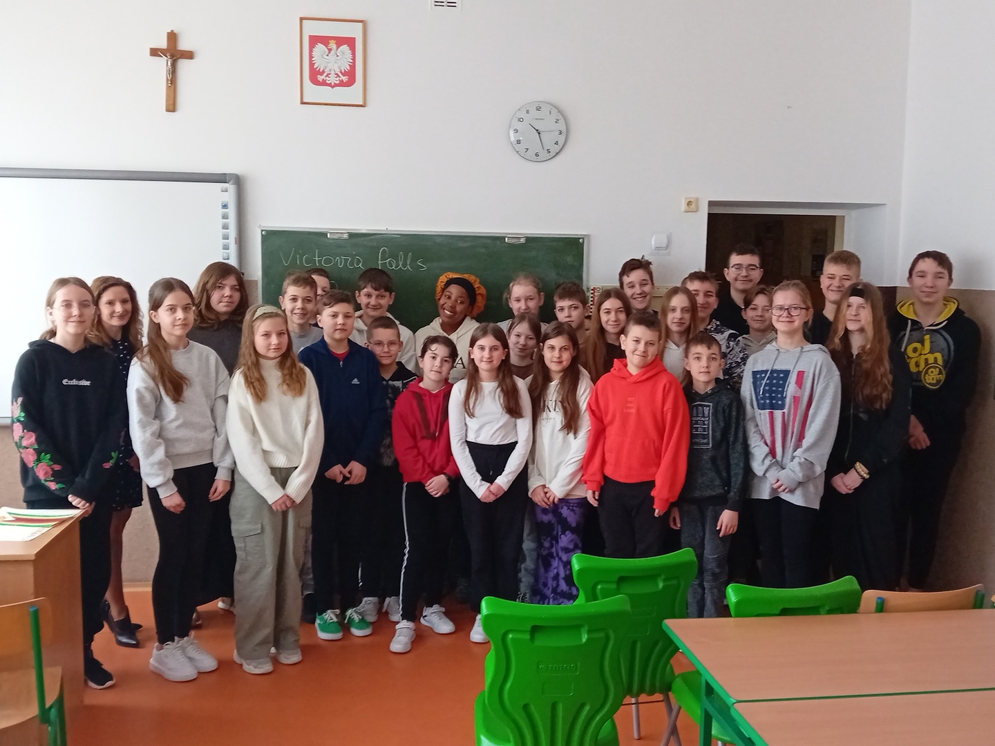 22 lutego gościliśmy w naszej szkole Michelle Majoni, obywatelkę Zimbabwe, która jest studentką na kierunku stosunki międzynarodowe w Warszawie. W trakcie spotkania z młodszymi uczniami Michelle Majoni przybliżyła położenie geograficzne swojego kraju, jego flagę oraz życie codzienne. Dzieci zostały zaangażowane w zabawę polegającą na odgadywaniu nazw zwierząt należących do Wielkiej Piątki Afryki. Michelle Majoni zaśpiewała również piosenki, których uczą się dzieci w Zimbabwe i ku zaskoczeniu naszych uczniów okazało się, że mają one polskie odpowiedniki. W trakcie drugiej części spotkania nasz gość zapoznawał starszych uczniów z faktami z życia codziennego i zawodowego mieszkańców Zimbabwe jak również z ciekawostkami z zakresu turystyki, ochrony środowiska, rolnictwa czy przemysłu wydobywczego. Uczniowie dowiedzieli się również o zmaganiach obywateli Zimbabwe o niepodległość oraz o symbolach umieszczonych na fladze tego kraju. Spotkanie odbyło się w języku angielskim i było dla wszystkich niezwykłym doświadczeniem.