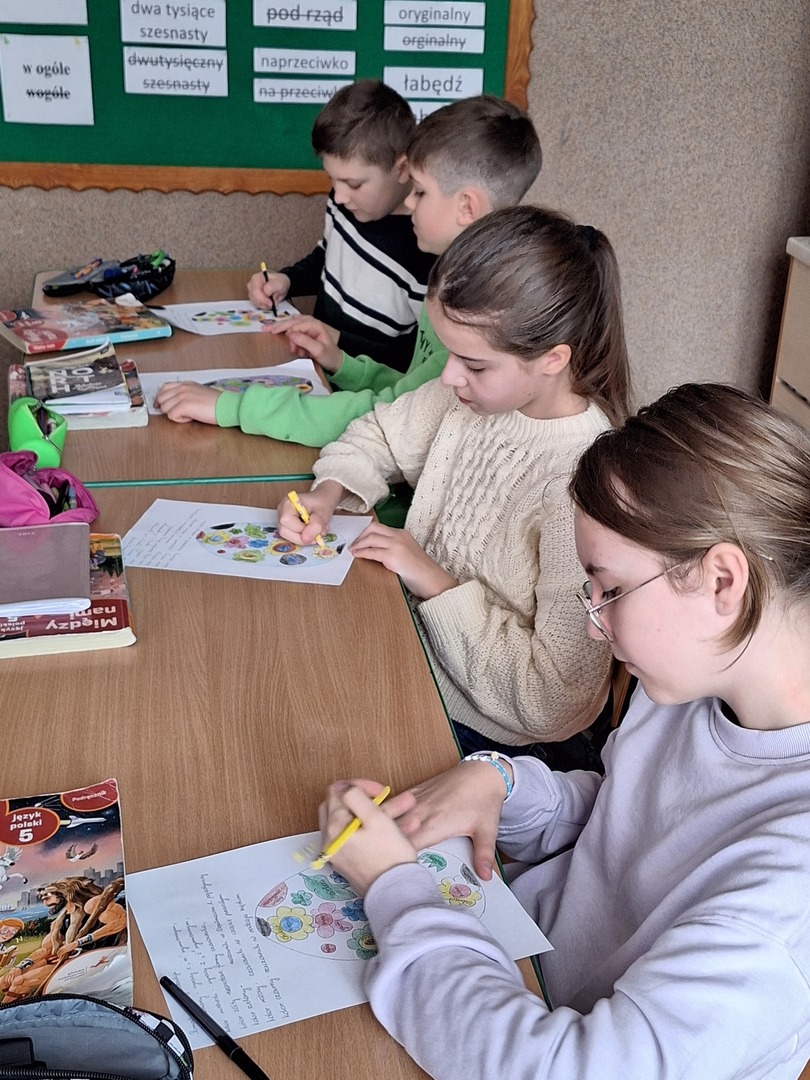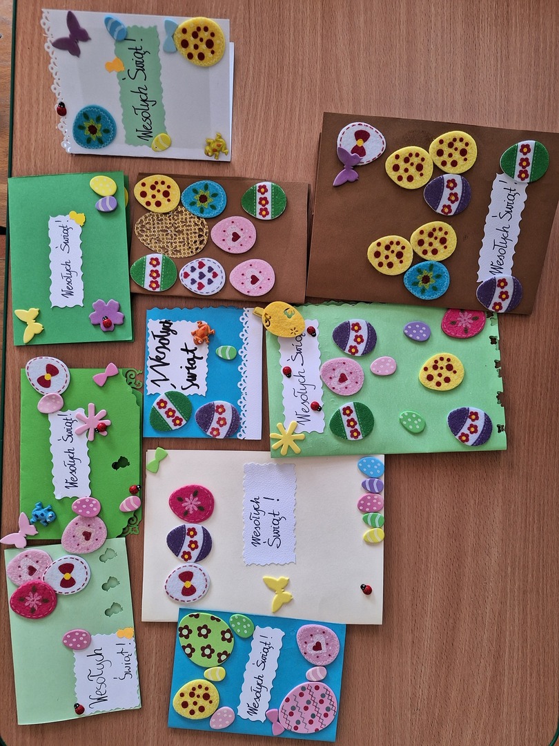 W tym tygodniu uczniowie klas IV-VIII wzięli udział w zajęciach, które nawiązywały do tematyki Świąt Wielkanocnych. W nietypowy sposób powtórzyli wiadomości z gramatyki języka polskiego. Ich zadaniem było pomalowanie pisanek według załączonej instrukcji. Aby wykonać polecenia w prawidłowy sposób, musieli wykazać się wiedzą dotyczącą części mowy, części zdania oraz typów wypowiedzeń. Jeśli jakieś zadanie sprawiało dzieciom trudność, mogły korzystać z pomocy technologii informacyjnych. Uczniowie klasy IV i V wykonali karty świąteczne, na których napisali zredagowane przez siebie życzenia. Świąteczna atmosfera sprzyjała rozmowom na temat kurpiowskich tradycji wielkanocnych.