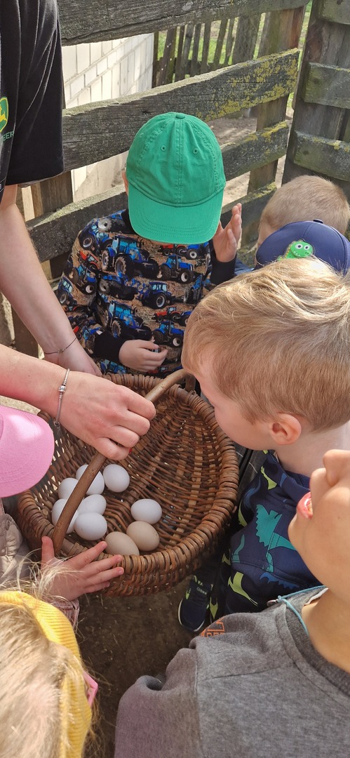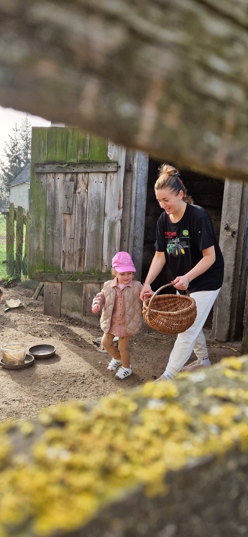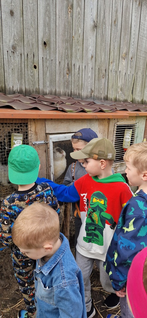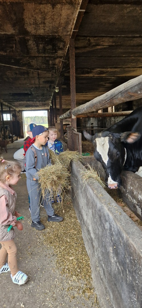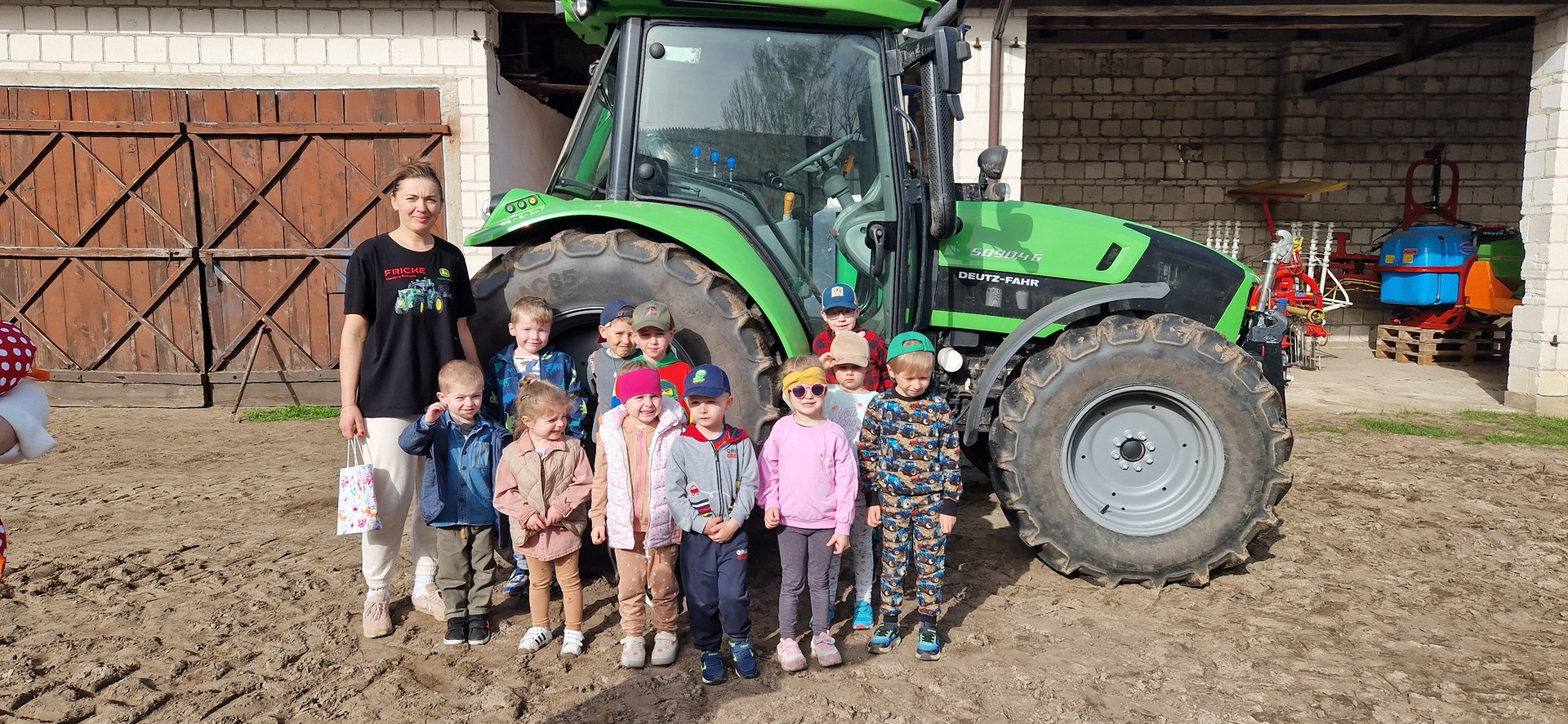 Przedszkolaki w ramach realizowanych tematów o wsi, wybrały się do pobliskiego gospodarstwa państwa Kasjaniuk. Celem wycieczki było zapoznanie dzieci z ciekawą pracą rolnika i wiejskim gospodarstwem, a przez to kształtowanie szacunku do ciężkiej pracy i otaczającej przyrody, z której można czerpać wiele korzyści. Przedszkolaki zwiedzały gospodarstwo rolne, dowiedziały się ciekawych rzeczy o hodowli zwierząt i uprawie roli jak również widziały hodowlane zwierzęta: kury, gołębie, krowy, króliki, pieski oraz maszyny rolnicze. Po drodze spotkaliśmy także bociany. Pani Agnieszka zebrała przy nas jaja od kur oraz pokazała nam pokarmy, którymi żywią się zwierzęta, a były to m. in. pszenica, kukurydza, siano, wysłodki buraczane. Dzięki takiej obserwacji zwierząt na żywo, dzieci łatwiej przyswoiły sobie wiedzę o nich. A co najważniejsze miały możliwość bezpośredniego spotkania się ze zwierzętami, co z pewnością było dla nich niezapomnianym przeżyciem.