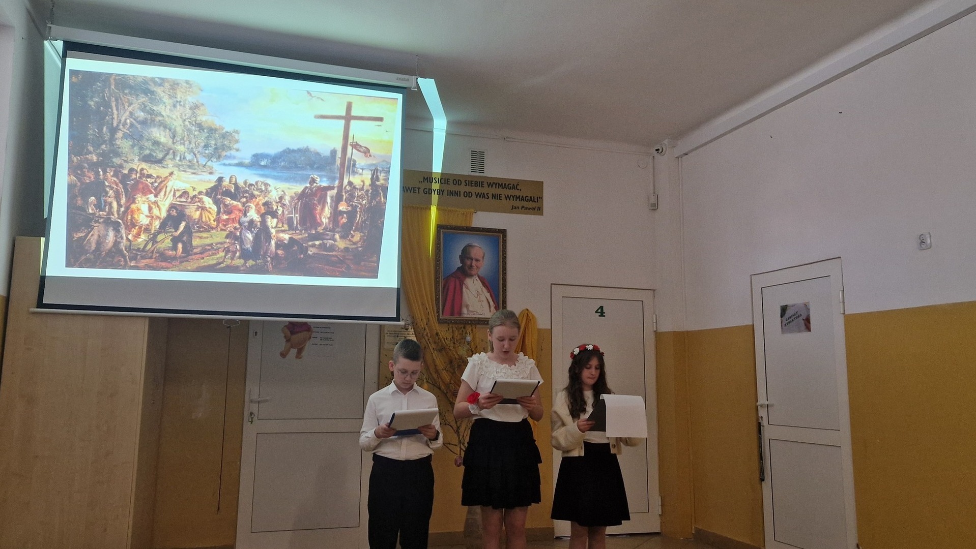 15 kwietnia społeczność naszej szkoły wzięła udział w apelu poświęconemu 1058. rocznicy Chrztu Polski. Uczniowie klasy szóstej opowiedzieli o przyczynach i skutkach przyjęcia chrztu przez Mieszka I, podkreślając, że to wydarzenie jest równoznaczne z historycznym powstaniem naszego państwa. Przygotowując się do obchodów tej niezwykłej rocznicy, uczniowie naszej szkoły wzięli udział w cyklu zajęć poświęconych historii przyjęcia chrztu przez Polskę.