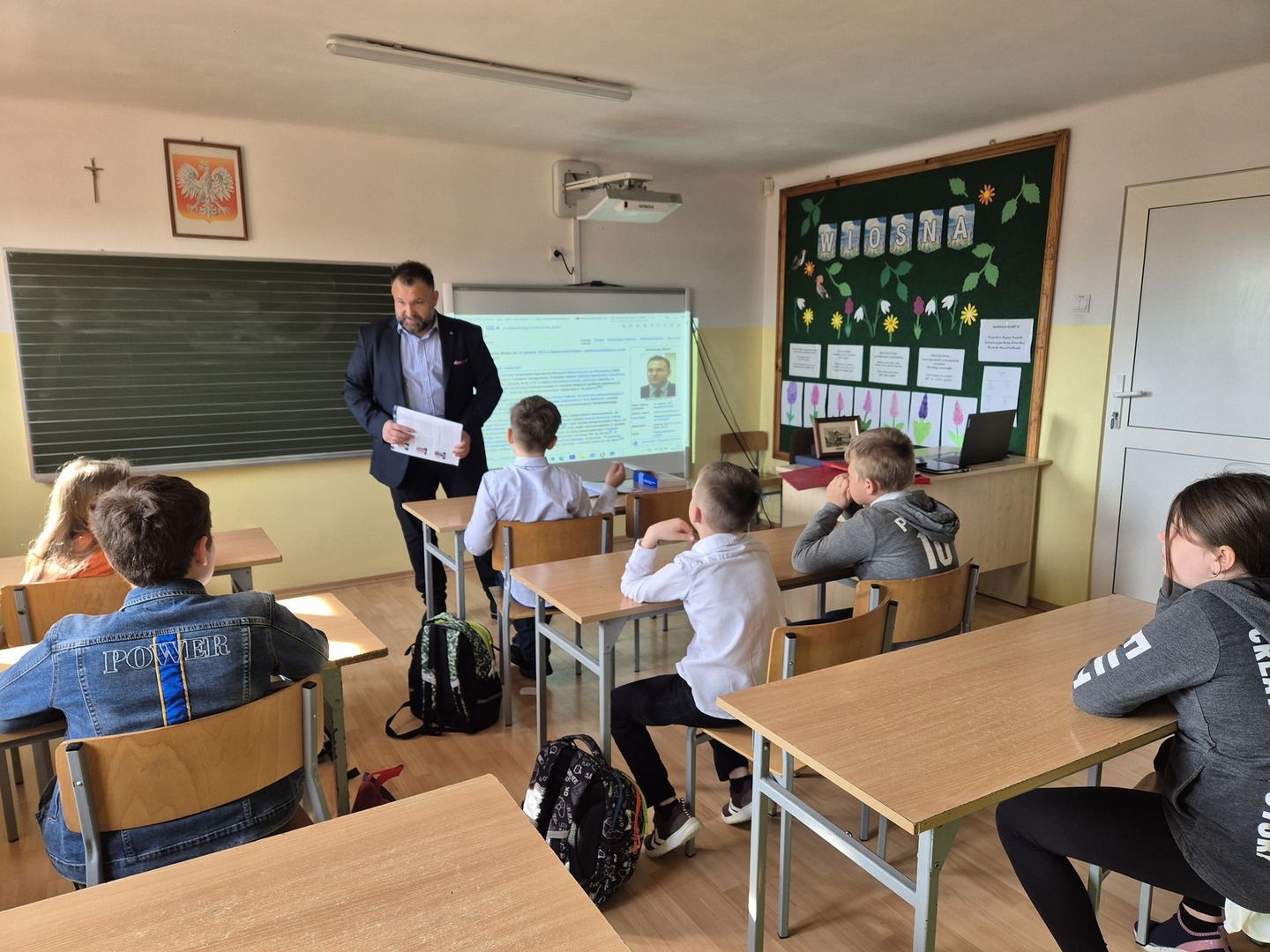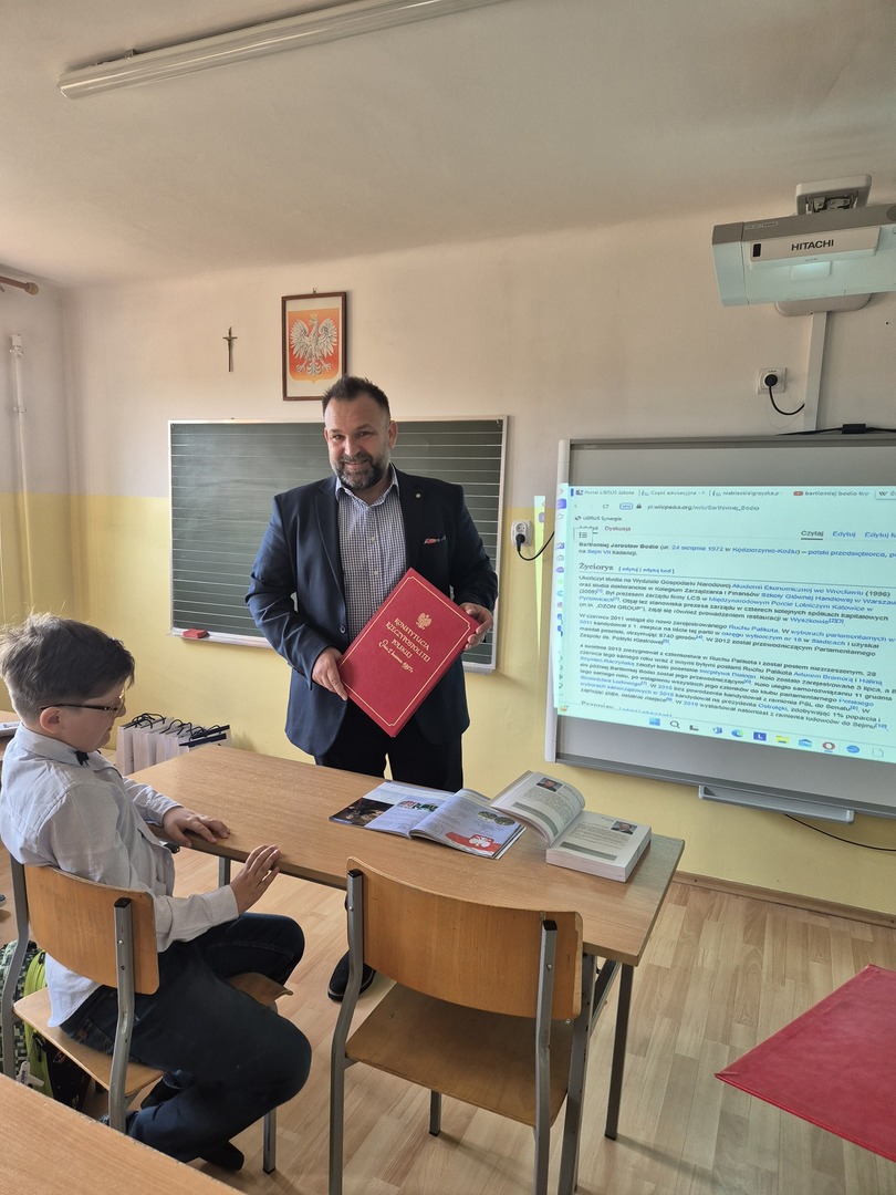 29 kwietnia odbyło się kolejne spotkanie w ramach innowacji „Zwykli – niezwykli”. Tym razem zawitał do nas Pan Bartłomiej Bodio, który jest Dyrektorem Biura Strategii i Rozwoju w Polskich Portach Lotniczych i był posłem na Sejm Rzeczypospolitej Polskiej VII Kadencji. Tata Filipa przybliżył uczniom na czym polegają wybory; jak wygląda praca posła; przedstawił nagrania z mównicy poselskiej; zaprezentował specjalne wydanie Konstytucji, którą posiada tylko tysiąc osób w Polsce.