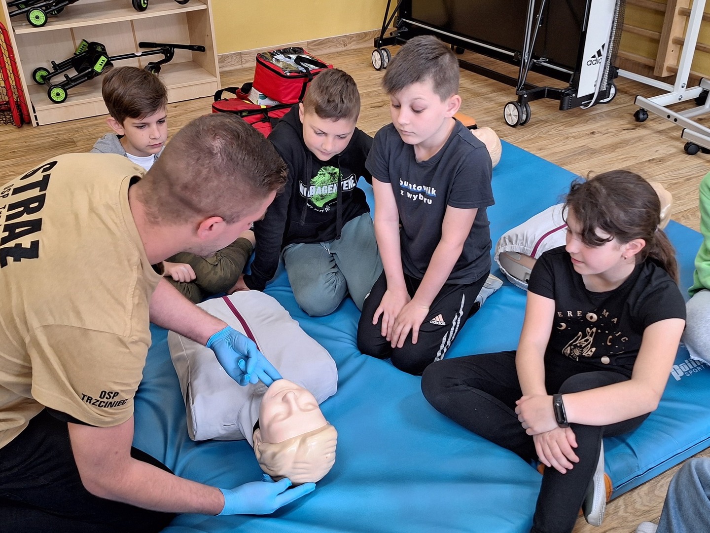 Uczniowie klasy czwartej w ramach przygotowań do egzaminu na Kartę rowerową uczestniczyli w szkoleniu Udzielanie pierwszej pomocy przedmedycznej. Szkolenie odbyło się w dwóch formach - wykładowej i warsztatowej. Prowadzący na początku przekazał istotne informacje dotyczące pierwszej pomocy, a następnie odbyły się ćwiczenia praktyczne. Czwartoklasiści z wykorzystaniem fantomów i rekwizytów ćwiczyli udzielanie pomocy w sytuacji zagrożenia życia i zdrowia osobom poszkodowanym - poznali sposób układania człowieka w pozycji bocznej bezpiecznej, wykonywali resuscytację krążeniowo-oddechową, zapoznali się z urządzeniem AED i jego działaniem, sposobem postępowania w przypadku otarć, skaleczeń, krwotoków czy urazów kostno-stawowych. Uczniowie aktywnie i chętnie uczestniczyli w spotkaniu, na co wpłynęła przyjazna atmosfera i sam prowadzący, który pozwolił dzieciakom na duże zaangażowanie w ćwiczenia i zadawanie nurtujących pytań. Dlatego wszyscy uczestnicy poszerzyli swoją wiedzę i umiejętności w zakresie pierwszej pomocy. Na zakończenie szkolenia Pan Mateusz wypowiedział bardzo ważne zdanie...REAGUJCIE I NIE BĄDŹCIE OBOJĘTNI - PIERWSZA POMOC PRZEDMEDYCZNA ZWIĘKSZA PRAWDOPODOBIEŃSTWO PRZEŻYCIA OSOBY POSZKODOWANEJ NAWET TRZYKROTNIE.