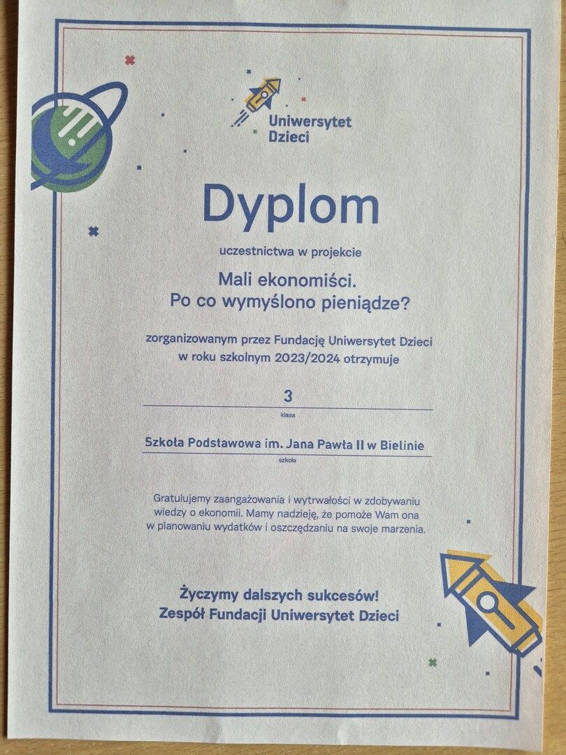 W bieżącym roku szkolnym uczniowie kl. III brali udział w projekcie edukacyjnym „Mali ekonomiści. Po co wymyślono pieniądze?” Podczas zajęć poznali historię pieniądza oraz różnych sposobów płacenia, od wymiany towarów aż po współczesną formę płatności online. Zrozumieli na czym polega oszczędzanie oraz jak planować wydatki. Mieli możliwość porozmawiać o wpływie reklamy na kupujących i podatkach. Na koniec zagrali w grę podsumowującą zdobyte wiadomości.