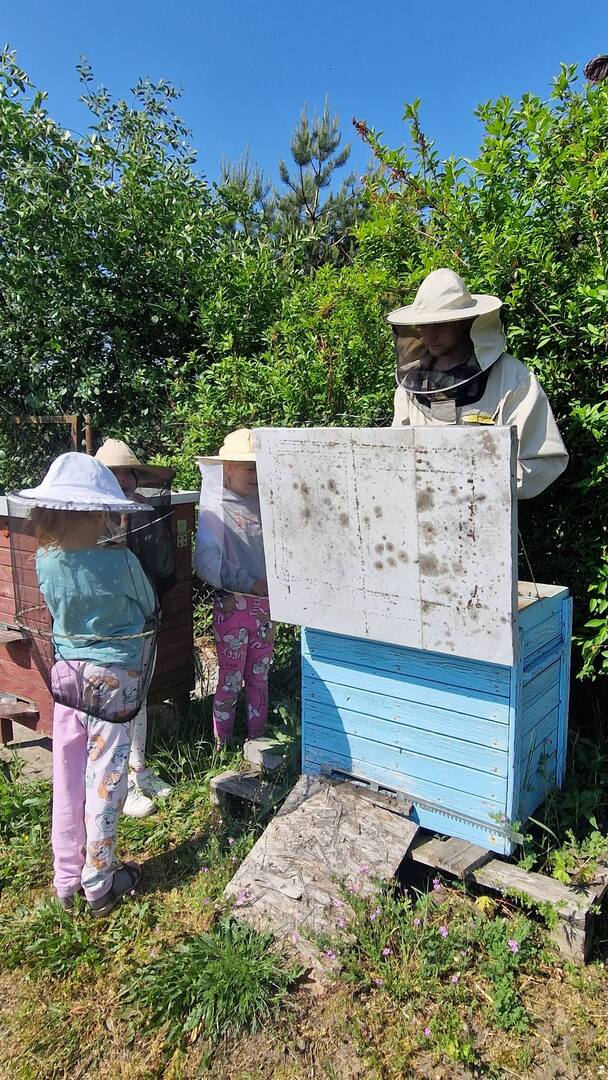Podczas realizacji projektu wybraliśmy się z wizytą do pobliskiej pasieki Pana Rembały, który z wielkim zaangażowaniem opowiedział dzieciom o pszczołach, ich życiu i zwyczajach. Pokazał, jak zbudowany jest ul i co dzieje się w jego środku. Dzieci dowiedziały się, w jaki sposób pozyskuje się miód, oglądały różne przybory pszczelarskie. Poznały m. in.: miodarkę, podkurzacz, odsklepiacz. Dzieci z ciekawością słuchały informacji o życiu pszczół oraz pozyskiwaniu matek pszczelich. Na koniec wizyty w pasiece każde dziecko otrzymało słoiczek miodu, który same odwirowały z plastrów pszczelich w miodarce.