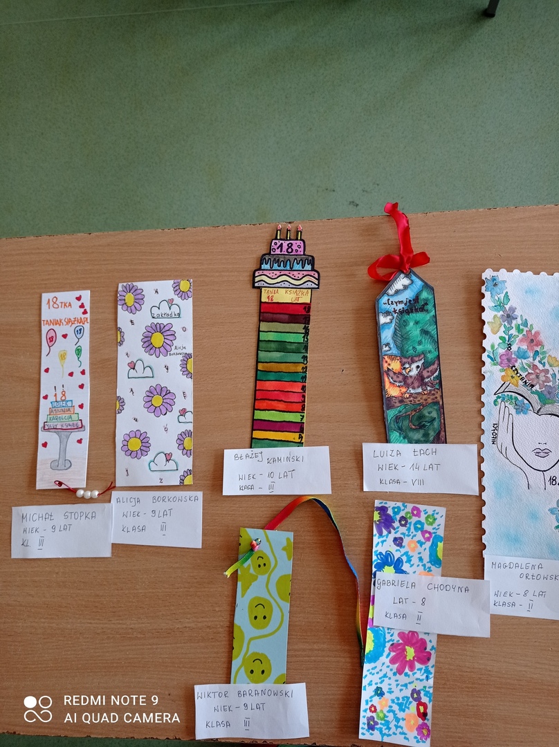 23 września zakończyliśmy zbieranie prac na konkurs "Zakładka na 18-kę", organizowany przez TaniaKsiazka.pl. Wszystkie zakładki zostały już wysłane do organizatora konkursu. Wzięło w nim udział siedmioro uczniów z naszej szkoly: Gabriela Chodyna, Magdalena Orłowska, Wiktor Baranowski, Alicja Borkowska, Michał Stopka, Błażej Kamiński i Luiza Łach. Wszystkie zakładki są piękne, Prezentujemy je poniżej, dziękujemy i życzymy sukcesów. Wyniki zostaną ogłoszone do 11 października na stronie internetowej