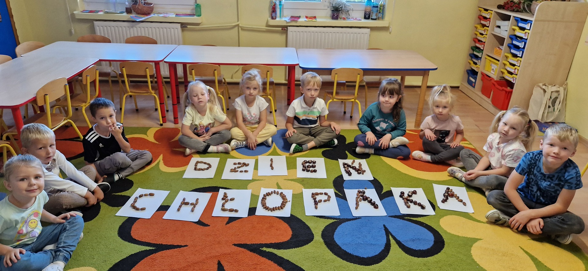 Przedszkolaki prezentują własnoręcznie wykonany z kasztanów i żołędzi napis ,,Dzień Chłopaka".