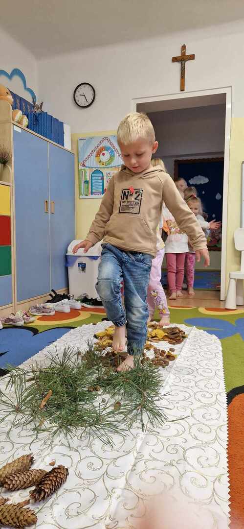 Jesień to kolorowa i wyjątkowa pora roku, to także czas zbiorów w sadzie i w ogrodzie. W sali przedszkolaków powstał kącik jesienny, w którym zgromadziliśmy dary jesieni przyniesione przez dzieci. Z owoców przedszkolaki przygotowały pyszne i kolorowe szaszłyki, przy okazji rozpoznawały smaki i zapachy. Dzieci dowiedziały się jakie korzyści płyną z jedzenia warzyw i owoców. Zadbaliśmy również o rozwój sensoryczny, tworząc jesienną ścieżkę sensoryczną. Wykorzystaliśmy kasztany, żołędzie, gałązki sosnowe, liście, szyszki. Przedszkolaki bardzo polubiły jesień i jej skarby.