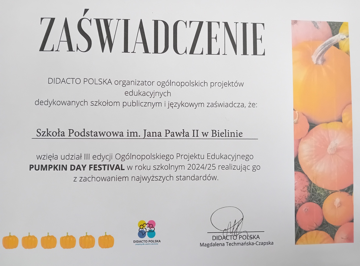 Pierwsze w naszej szkole Dni Dyni w ramach III edycji Ogólnopolskiego Projektu Edukacyjnego PUMPKIN DAY FESTIVAL już za nami. Uczniowie aktywnie uczestniczyli w działaniach związanych ze świętem dyni. Celem projektu było stworzenie naszym uczniom możliwości poszerzenia wiedzy o kulturze krajów anglojęzycznych oraz doskonalenie umiejętności językowych. Zwieńczeniem dyniowego tygodnia było rozstrzygnięcie Szkolnego konkursu na najzabawniejszą dynię. Kreatywność i pomysłowość naszych uczniów przerosła oczekiwania organizatora. Dziękujemy za wspólną zabawę!