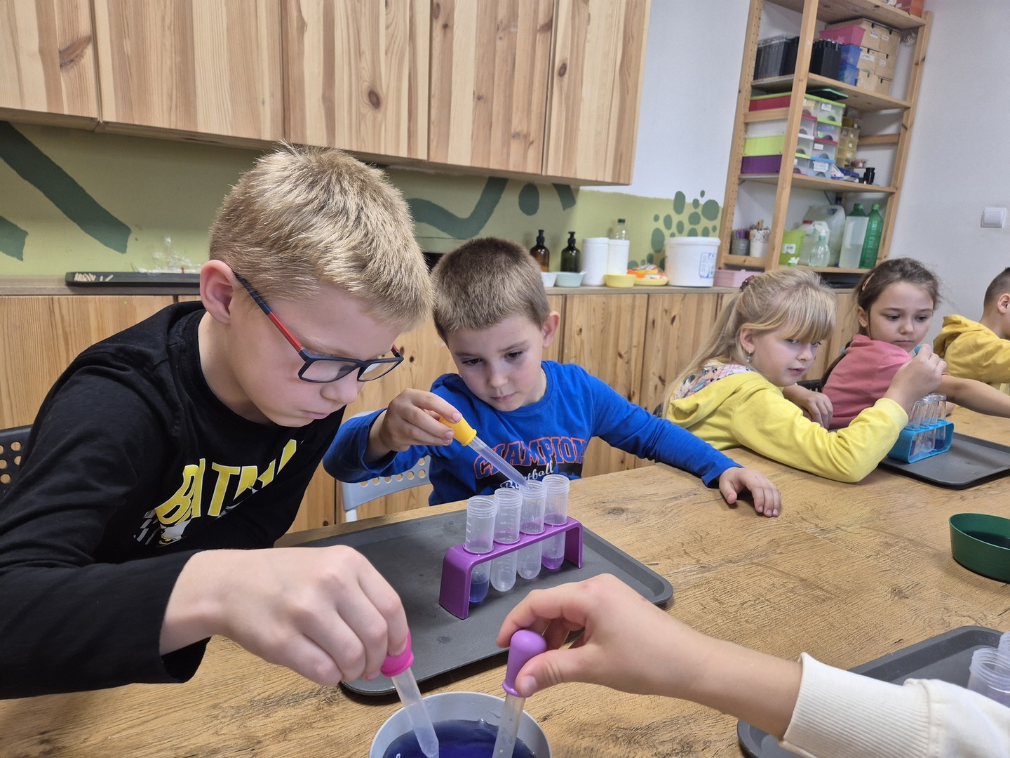 29 października dzieci z oddziału przedszkolnego i uczniowie klas I-III wybrali się na wycieczkę do Wyszkowa. Pierwszym punktem programu była Pracownia Zabawy i Rozwoju ,,MADU". Na początku zostaliśmy miło przywitani przez Panie, które przeprowadziły pogadankę na temat jesieni i zabawę z dynią. Następnie dzieci udały się na zajęcia z doświadczeniami, podczas których sprawdzały, jak woda zmienia kolory pod wpływem czynników chemicznych. Przelewały, mieszały, zgadywały, które składniki mają odczyn zasadowy, a które kwasowy. Na koniec tego doświadczenia stworzyły wulkan. Głównym celem eksperymentów było rozbudzenie wyobraźni dziecięcej oraz zapoznanie ich z nowymi pojęciami i zjawiskami. Kolejnym punktem było spotkanie z jeżem pigmejskim. Dzieci dowiedziały się wielu ciekawostek o tym zwierzątku i mogły również wziąć go na ręce. Na koniec wszyscy świetnie bawili się na jesiennej ścieżce sensorycznej i wykonali swoje własne jeże z gliny oraz drewnianych patyczków. Podsumowaniem wycieczki był posiłek w restauracji. Zadowoleni wróciliśmy do szkoły.
